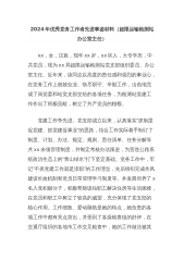 2024年优秀党务工作者先进事迹材料(超限运输检测站办公室主任)xx,女,汉族,现年xx岁,xx区人,大专学历,中共党员,现为xx局超限运输检测站党支部组织委员、办公室主任。近年来,该同志以高度的责任感和强烈的事业心,在党务工作上兢兢业业、恪尽职守、辛勤工作,出色地完成了局党委和站党支部交给的各项任务,为检测站党建工作作出了积极贡献,树立了共产党员的楷模。党建工作争先进。党支部成立以来,认真落实“抓制度促党建、抓党建促事业”的思路,结合工作实际着手制订了制度、计划、办法、规定、规则、责任清单、任务分解等共xx余项管理制度,并制定考核办法跟进,为营造公路系统政治生态上的“青山绿水”打下坚定基础。...