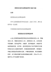医院党支部先进事迹材料汇编(3篇)目录医院医技党支部事迹材料市中心医院重症医学科党支部:念好三字经,树行业标杆创一流业绩中医医院针推药剂党支部事迹材料医院医技党支部事迹材料x县人民医院城东院区医技党支部现有党员x名,预备党员x名,预备党员转正x名,发展党员x名,分布在医学影像科、医学超声科、功能科、医学检验科、体检科等临床医技科室。近年来,该支部坚持以习近平新时代中国特色社会主义思想为指导,全面加强党的领导,将党建工作融入医院改革发展全过程,不断创新探索,将支部建到科室,全力推动党建与业务深度融合发展,20xx年x月,被评为x市“红旗型”党支部。一、聚焦队伍建设,选优配强支部班子。20xx年x...