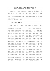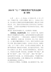 2024年“七一”表彰优秀共产党员先进事迹材料X,男,XX人,X年出生,X年参加工作,X年X月加入中国共产党,大学文化程度,现任X。自参加工作以来,他始终以正确的态度和饱满的热情投入理论学习和具体业务工作,坚持以求真务实的工作作风作出了优异的工作成绩,以实际行动诠释着共产党员的责任与担当,得到了领导和同事们的一致肯定和高度认可,先后荣获X等表彰。信仰坚定,政治素养过硬。作为一名党员干部,他深知理论学习的重要性和必要性。始终坚持把提升政治理论素养作为一种政治责任、一种信念追求,注重在学习中锤炼党性,增强原则,站稳立场,坚定信仰,初心不改,使命牢记。注重在学懂弄通做实上下功夫,把学习成果内化为指导...