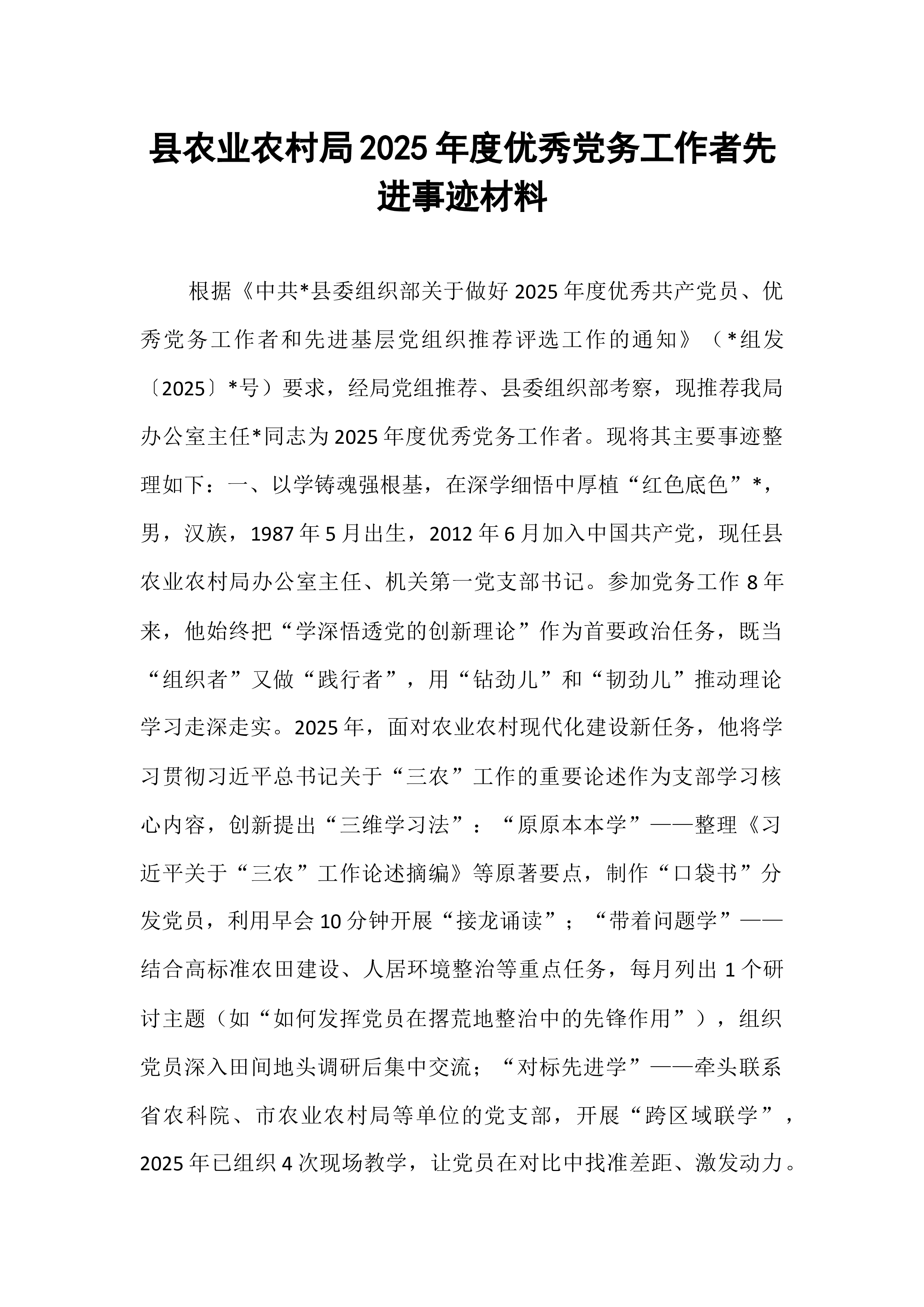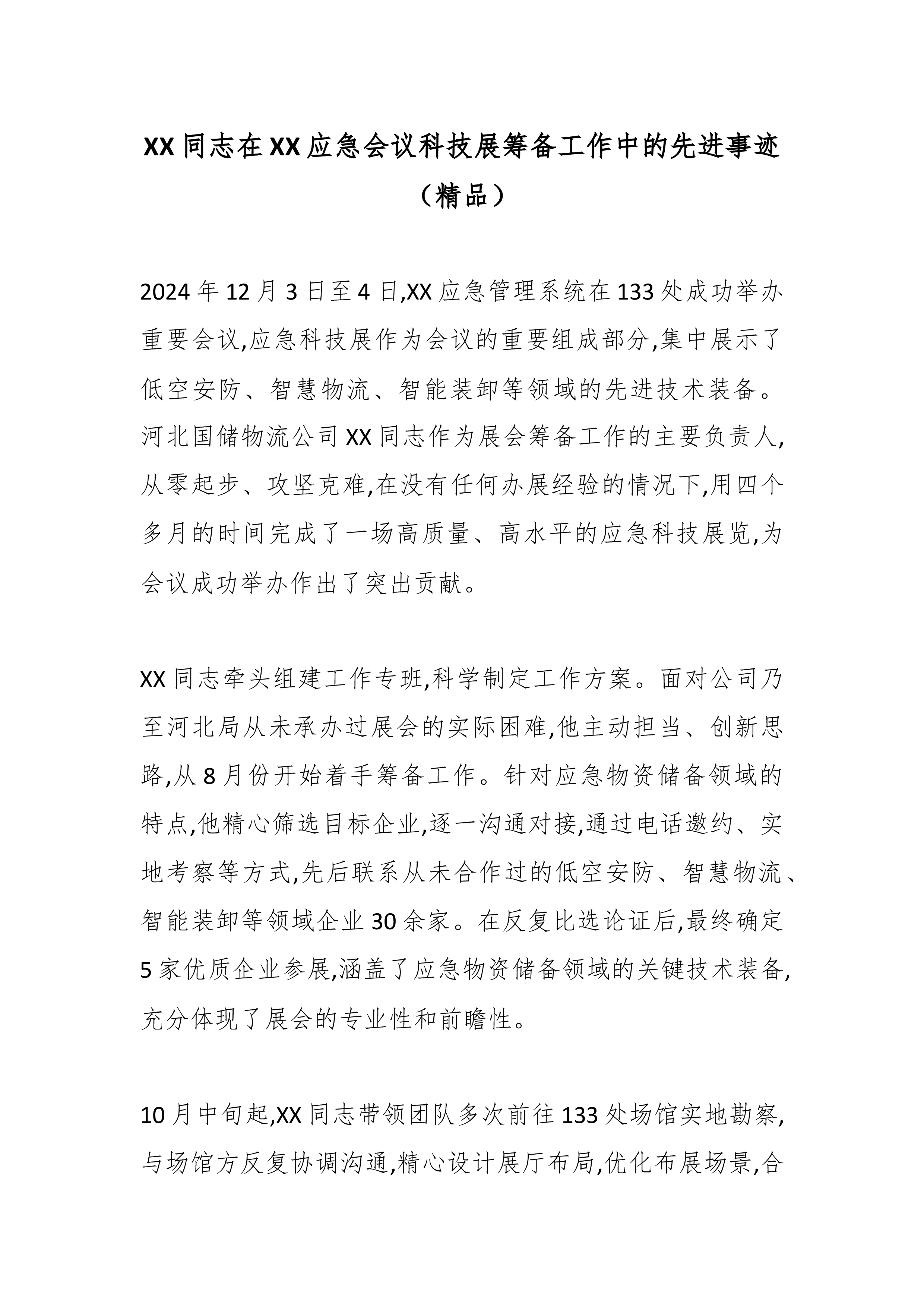 XX同志在XX应急会议科技展筹备工作中的先进事迹(精品)2024年12月3日至4日,XX应急管理系统在133处成功举办重要会议,应急科技展作为会议的重要组成部分,集中展示了低空安防、智慧物流、智能装卸等领域的先进技术装备。河北国储物流公司XX同志作为展会筹备工作的主要负责人,从零起步、攻坚克难,在没有任何办展经验的情况下,用四个多月的时间完成了一场高质量、高水平的应急科技展览,为会议成功举办作出了突出贡献。XX同志牵头组建工作专班,科学制定工作方案。面对公司乃至河北局从未承办过展会的实际困难,他主动担当、创新思路,从8月份开始着手筹备工作。针对应急物资储备领域的特点,他精心筛选目标企业,逐一沟通对接,通过电话邀约、实地考察等方式,先后联系从未合作过的低空安防、智慧物流、智能装卸等领域企业30...