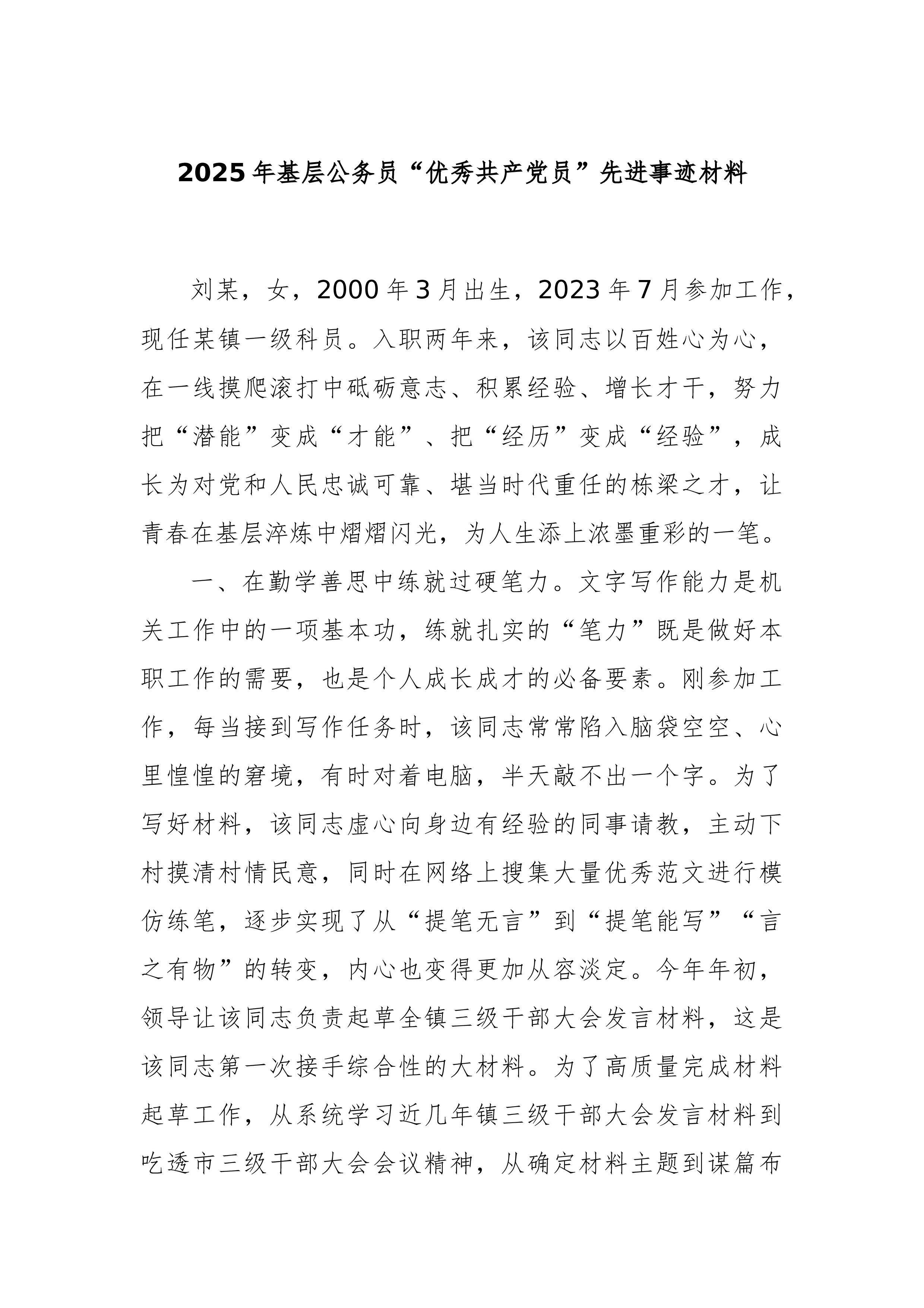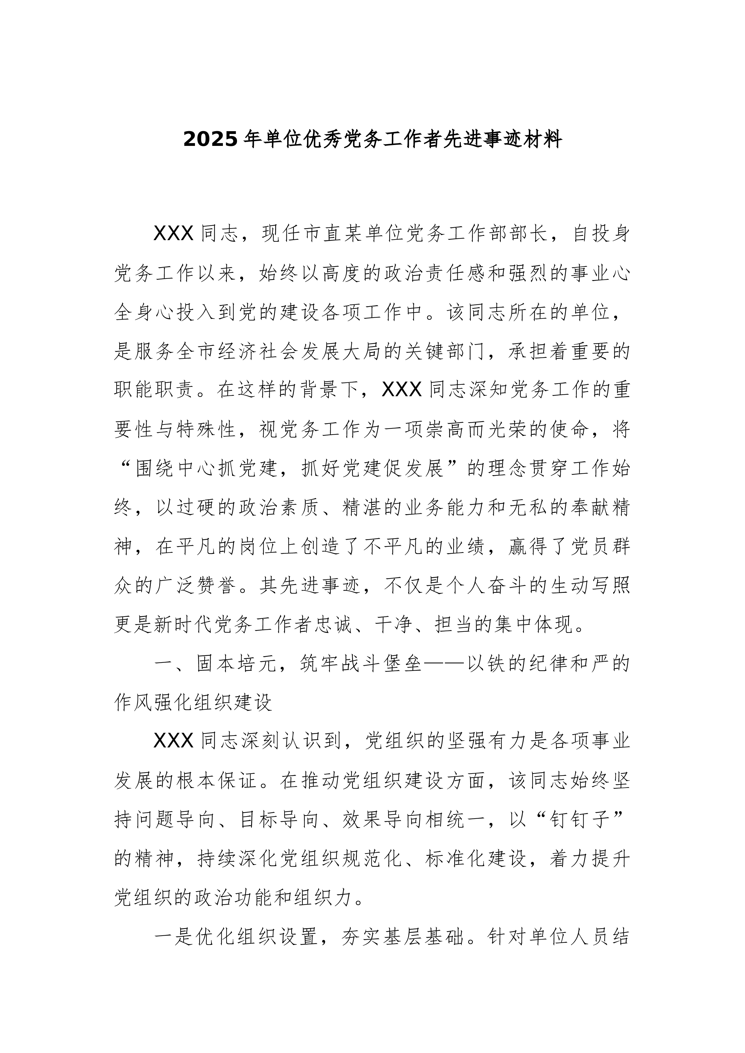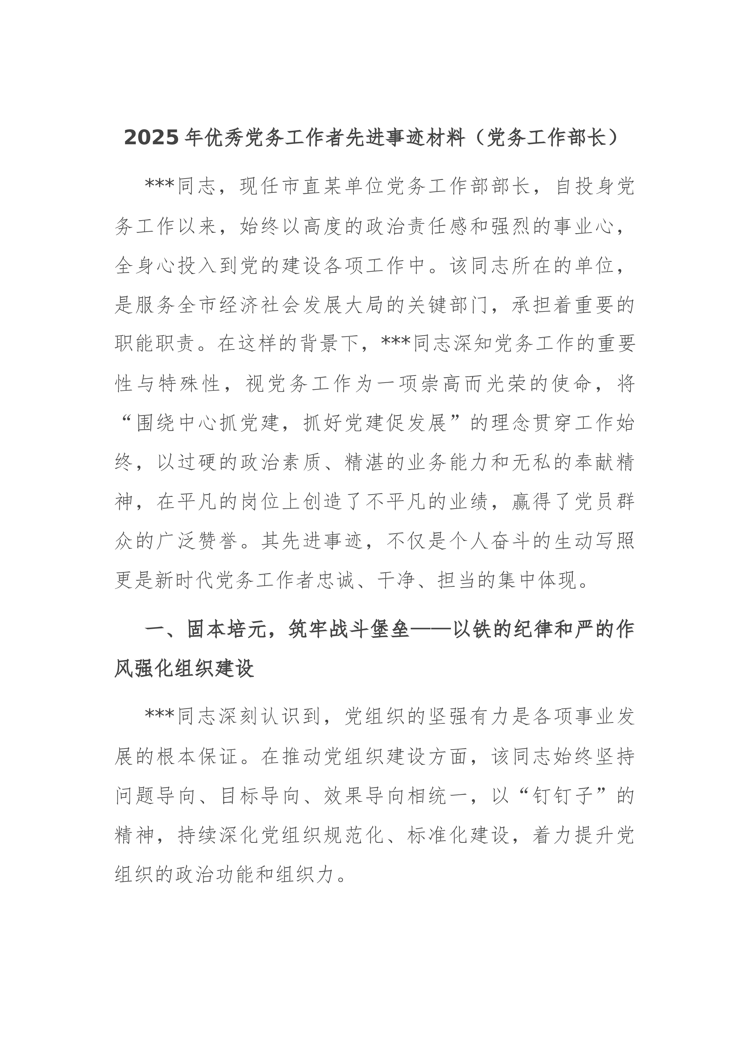 2025年优秀党务工作者先进事迹材料(党务工作部长)***同志,现任市直某单位党务工作部部长,自投身党务工作以来,始终以高度的政治责任感和强烈的事业心,全身心投入到党的建设各项工作中。该同志所在的单位,是服务全市经济社会发展大局的关键部门,承担着重要的职能职责。在这样的背景下,***同志深知党务工作的重要性与特殊性,视党务工作为一项崇高而光荣的使命,将“围绕中心抓党建,抓好党建促发展”的理念贯穿工作始终,以过硬的政治素质、精湛的业务能力和无私的奉献精神,在平凡的岗位上创造了不平凡的业绩,赢得了党员群众的广泛赞誉。其先进事迹,不仅是个人奋斗的生动写照更是新时代党务工作者忠诚、干净、担当的集中体现。一、固本培元,筑牢战斗堡垒——以铁的纪律和严的作风强化组织建设***同志深刻认识到,党组织的坚强有...