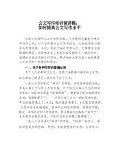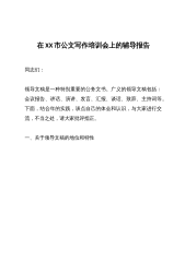 在全市公文写作培训会上的辅导报告(浅谈起草领导讲话稿)同志们:领导文稿是一种特别重要的公务文书。广义的领导文稿包括:会议报告、讲话、演讲、发言、汇报、谈话、致辞、主持词等。下面,结合年的实践,谈点自己的体会和认识,与大家进行交流,不当之处,请大家批评指正。一、关于领导文稿的地位和特性领导文稿是至关重要的。一方面,从其地位和影响来看。举三个例子:邓小平同志1978年12月13日在中央工作会议上所作的《解放思想,实事求是,团结一致向前看》的讲话(史称“党的十一届三中全会的主题报告”),1992年1月18日至21日在武昌、深圳珠海、上海等地的谈话要点(史称“南方谈话”),可以说是我国改革开放的宣言书...