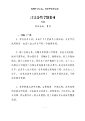 仅限学习交流,请勿抄袭和出售—1—垃圾分类专题素材网络垃圾分类素材一、习语(7条)1、实行垃圾分类,关系广大人民群众生活环境,关系节约使用资源,也是社会文明水平的一个重要体现。2、推行垃圾分类,关键是要加强科学管理、形成长效机制、推动习惯养成。要加强引导、因地制宜、持续推进,把工作做细做实,持之以恒抓下去。要开展广泛的教育引导工作,让广大人民群众认识到实行垃圾分类的重要性和必要性,通过有效的督促引导,让更多人行动起来,培养垃圾分类的好习惯,全社会人人动手,一起来为改善生活环境作努力,一起来为绿色发展、可持续发展作贡献。3、要加快建立分类投放、分类收集、分类运输、分类处理的垃圾处理系统,形成以法...