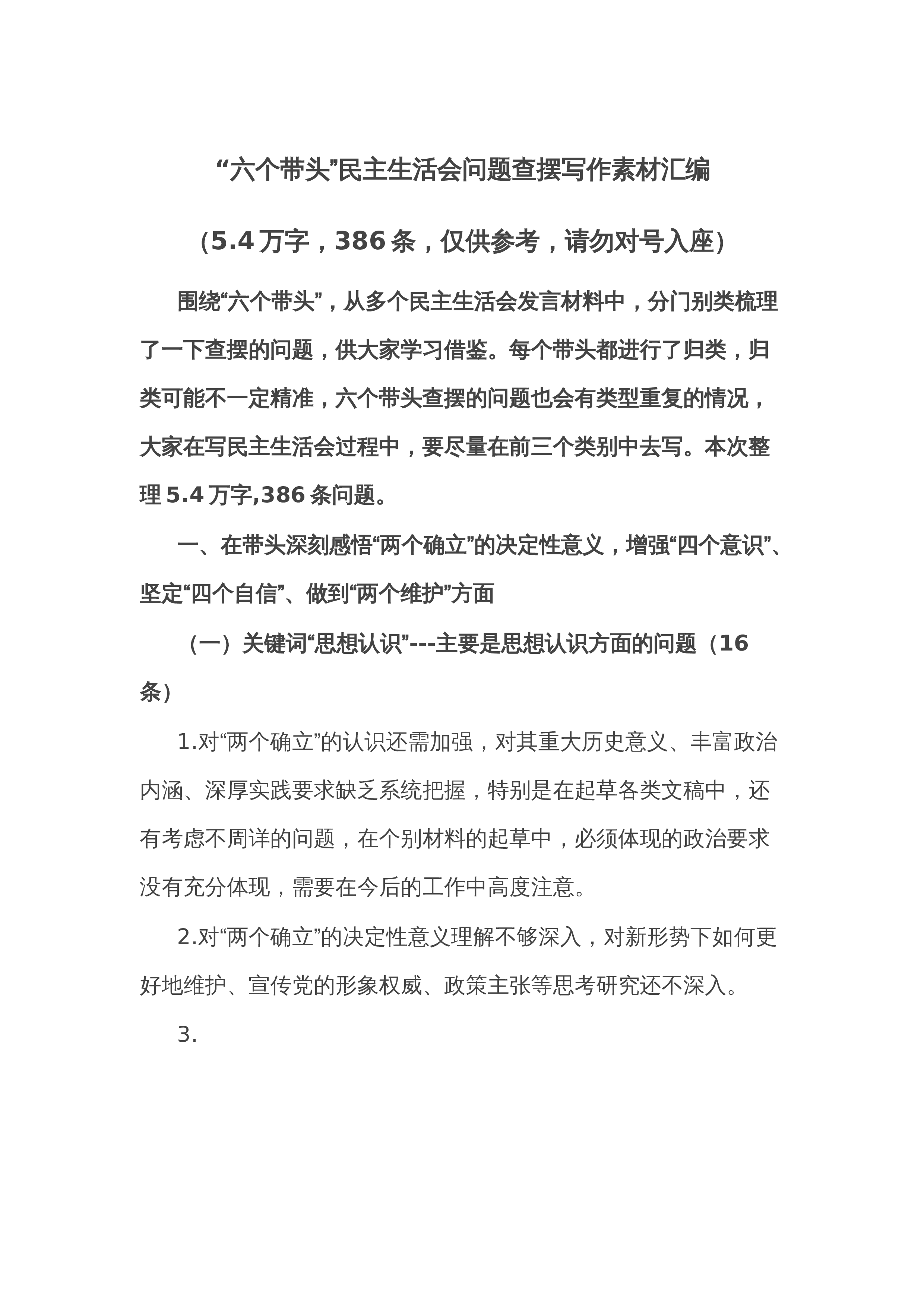 “六个带头”民主生活会问题查摆写作素材汇编(5.4万字,386条,仅供参考,请勿对号入座)围绕“六个带头”,从多个民主生活会发言材料中,分门别类梳理了一下查摆的问题,供大家学习借鉴。每个带头都进行了归类,归类可能不一定精准,六个带头查摆的问题也会有类型重复的情况,大家在写民主生活会过程中,要尽量在前三个类别中去写。本次整理5.4万字,386条问题。一、在带头深刻感悟“两个确立”的决定性意义,增强“四个意识”、坚定“四个自信”、做到“两个维护”方面(一)关键词“思想认识”---主要是思想认识方面的问题(16条)1.对“两个确立”的认识还需加强,对其重大历史意义、丰富政治内涵、深厚实践要求缺乏系统...