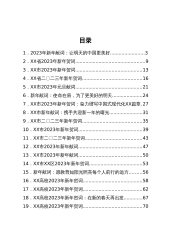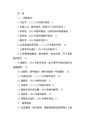 目录一、党政机关1.习近平:二〇二三年新年贺词12.全国人大:新年献词:将奋斗汇入时代长河43.钟华论:2023年新年献词:让明天的中国更美好74.贵州省:2023年贵州省新年贺词115.重庆市:2023年新年贺词146.山东省省长周乃翔:二〇二三年新年贺词167.上海市市长龚正:2023年元旦献词198.人民网海南频道:新年献词:使命在肩,为了更美好的明天219.成都市:2023年新年贺词:奋力谱写中国式现代化成都篇章2310.沈阳市:新年献词:携手共迎新一年的曙光2511.巴彦淖尔市:二〇二三年新年贺词2812.襄阳市:2023年新年贺词3113.乌海市:二〇二三年新年贺词3414.铁岭市...