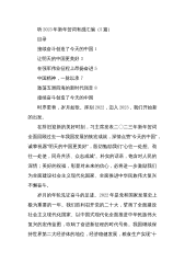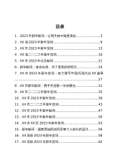 目录一、党政机关1.习近平:二〇二三年新年贺词12.全国人大:新年献词:将奋斗汇入时代长河43.钟华论:2023年新年献词:让明天的中国更美好74.贵州省:2023年贵州省新年贺词115.重庆市:2023年新年贺词146.山东省省长周乃翔:二〇二三年新年贺词167.上海市市长龚正:2023年元旦献词198.人民网海南频道:新年献词:使命在肩,为了更美好的明天219.成都市:2023年新年贺词:奋力谱写中国式现代化成都篇章2310.沈阳市:新年献词:携手共迎新一年的曙光2511.巴彦淖尔市:二〇二三年新年贺词2812.襄阳市:2023年新年贺词3113.乌海市:二〇二三年新年贺词3414.铁岭市...