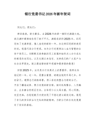 国企党委书记学习2026年新年贺词发言同志们:岁序更替,华章日新。在新年到来之际,总书记发表的2026年新年贺词,回顾了2025年“十四五”收官之年的辉煌成就,展望了2026年“十五五”开局之年的光明前景。作为国企党委书记,我深受鼓舞、倍感振奋。我们要深入学习领会新年贺词精神,从中汲取奋进力量,立足国企实际,真抓实干,为续写中国奇迹新篇章贡献国企力量。一、感悟伟大成就,坚定国企发展信心一是见证辉煌成就,增强自豪感。2025年是“十四五”收官之年,我国经济总量预计达到xxx万亿元,经济实力、科技实力、国防实力、综合国力跃上新台阶,绿水青山成为亮丽底色,人民群众获得感幸福感安全感不断增强。这些成就的取得,充分展示了中国特色社会主义制度的优越性和强大生命力。作为国有企业,我们不仅是国家经济的重要支...
