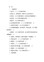 目录一、党政机关1.习近平:二〇二三年新年贺词12.全国人大:新年献词:将奋斗汇入时代长河43.钟华论:2023年新年献词:让明天的中国更美好74.贵州省:2023年贵州省新年贺词115.重庆市:2023年新年贺词146.山东省省长周乃翔:二〇二三年新年贺词167.上海市市长龚正:2023年元旦献词198.人民网海南频道:新年献词:使命在肩,为了更美好的明天219.成都市:2023年新年贺词:奋力谱写中国式现代化成都篇章2310.沈阳市:新年献词:携手共迎新一年的曙光2511.巴彦淖尔市:二〇二三年新年贺词2812.襄阳市:2023年新年贺词3113.乌海市:二〇二三年新年贺词3414.铁岭市...
