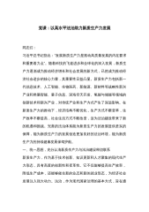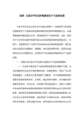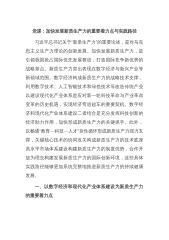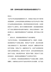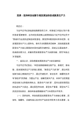党课:以科技创新和产业创新深度融合助力发展新质生产力 同志们: 科技兴则民族兴,科技强则国家强。习近平总书记强调,扎实推动科技创新和产业创新深度融合,助力发展新质生产力。中国式现代化要靠科技现代化作支撑,实现高质量发展要靠科技创新培育新动能。增加高质量科技供给是基础,强化企业科技创新主体地位是关键,促进科技成果转化应用是途径,健全完善科技法治是保障。党的二十届三中全会通过的《中共中央关于进一步全面深化改革、推进中国式现代化的决定》提出:“健全因地制宜发展新质生产力体制机制。”“健全相关规则和政策,加快形成同新质生产力更相适应的生产关系,促进各类先进生产要素向发展新质生产力集聚,大幅提升全要...