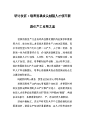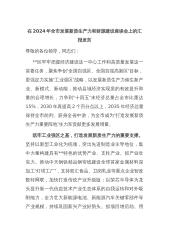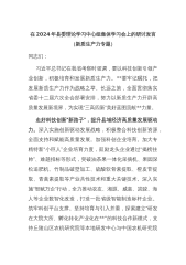 在2024年县委理论学习中心组集体学习会上的研讨发言(新质生产力专题)同志们:习近平总书记在我省考察时强调,要以科技创新引领产业创新,积极培育和发展新质生产力。**要牢记嘱托,把发展新质生产力作为战略之举、长远之策,全面贯彻落实省委十二届六次全会部署安排,努力以新质生产力开辟高质量发展新境界,为实现“三高四新”美好蓝图贡献**力量。走好科技创新“新路子”,提升县域经济高质量发展驱动力。深入实施创新驱动发展战略,积极整合科技创新资源,全面支持和赋能高质量发展。加强科创企业培育。加大专精特新“小巨人”企业培育力度,鼓励龙头企业通过“揭榜挂帅”、难题招标等形式,突破油茶果一体化采摘机、果园深松追肥机...