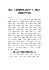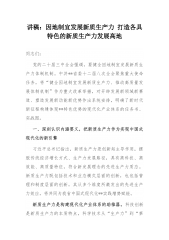 党课:因地制宜发展新质生产力,塑造高质量发展新动能同志们:党的二十届三中全会作出健全因地制宜发展新质生产力体制机制的部署,提出要健全相关规则和政策,加快形成同新质生产力更相适应的生产关系,促进各类先进生产要素向发展新质生产力集聚,大幅提升全要素生产率。**作为典型的资源型地区,培育发展新质生产力是突破传统产业转型瓶颈的钥匙,也是布局发展战略性新兴产业和未来产业的依托,更是构建现代化产业体系、重塑产业竞争力、夯实制造业支撑的重要着力点。健全适应省情特点的发展新质生产力的体制机制,既需要对标先进地区体制机制创新经验“抄好作业”,又需要仔细研究自身发展存在的现实问题“开好药方”。依据资源要素禀赋、产...
