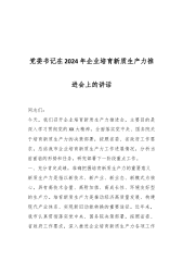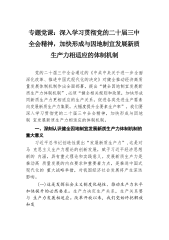 专题党课:深入学习贯彻党的二十届三中全会精神,加快形成与因地制宜发展新质生产力相适应的体制机制党的二十届三中全会通过的《中共中央关于进一步全面深化改革、推进中国式现代化的决定》对健全推动经济高质量发展体制机制作出全面部署,提出“健全因地制宜发展新质生产力体制机制”,必须“健全相关规则和政策,加快形成同新质生产力更相适应的生产关系,促进各类先进生产要素向发展新质生产力集聚,大幅度提升全要素生产率”。我们要深入学习贯彻党的二十届三中全会精神,加快形成与因地制宜发展新质生产力相适应的体制机制。一、深刻认识健全因地制宜发展新质生产力体制机制的重大意义习近平总书记创造性提出“发展新质生产力”,这是对马克...
