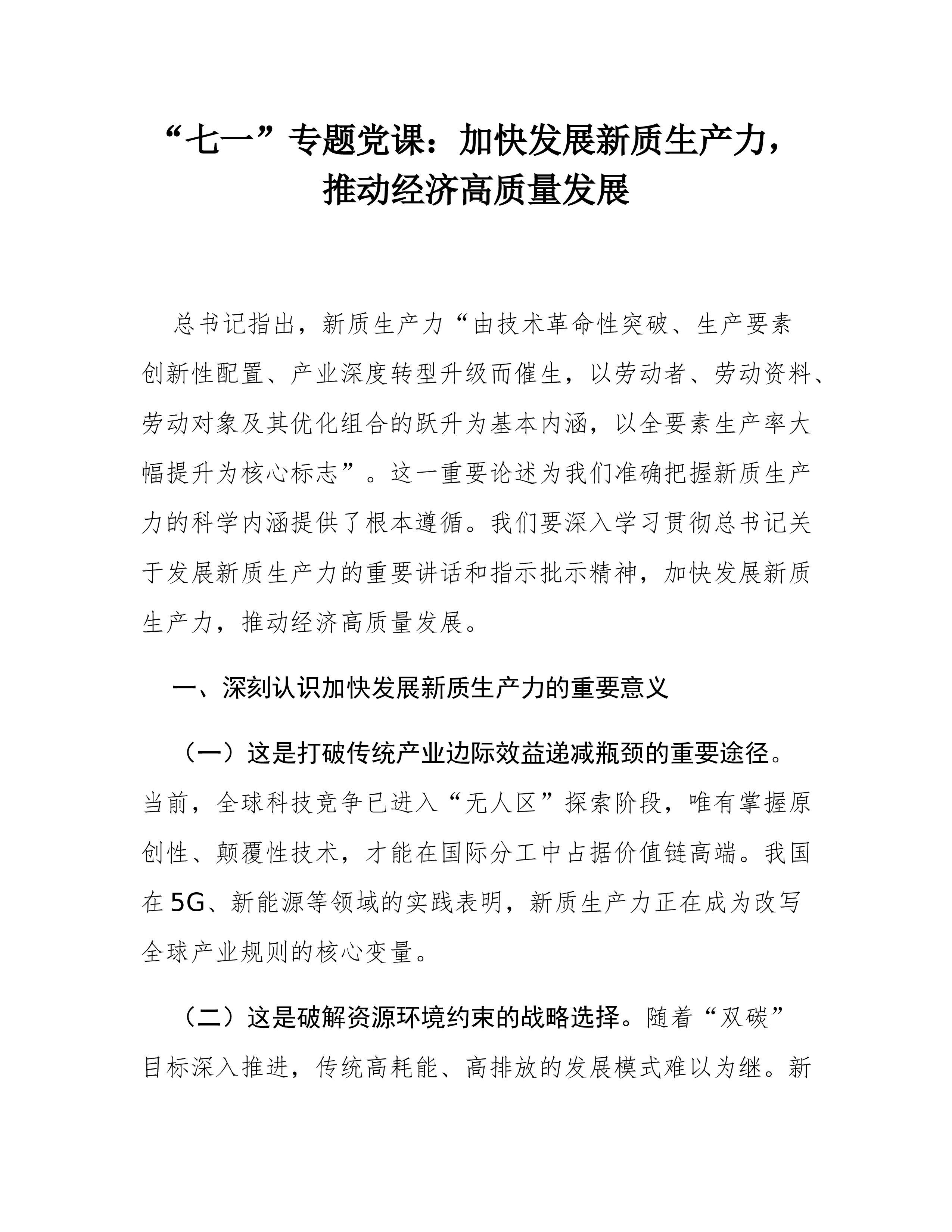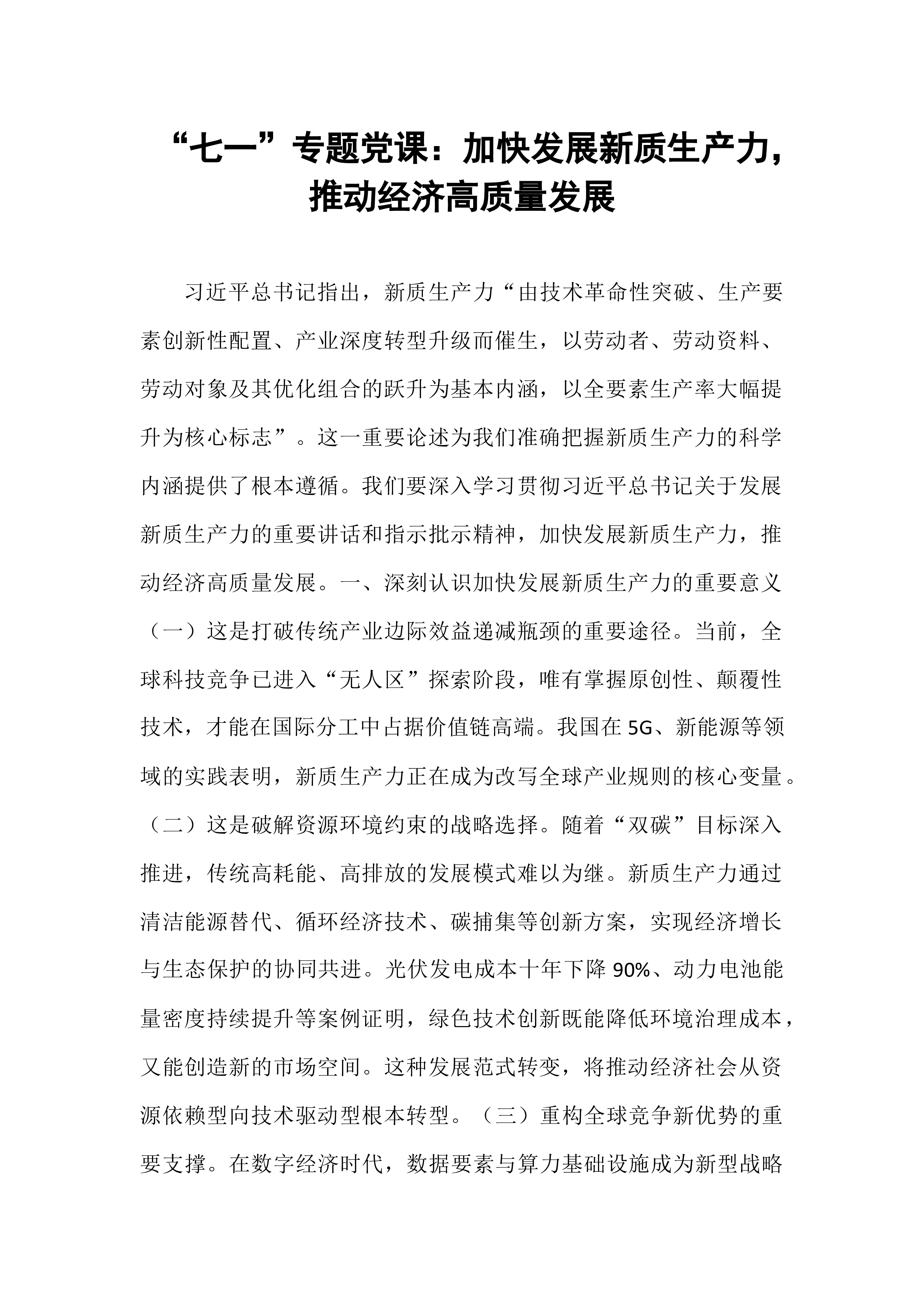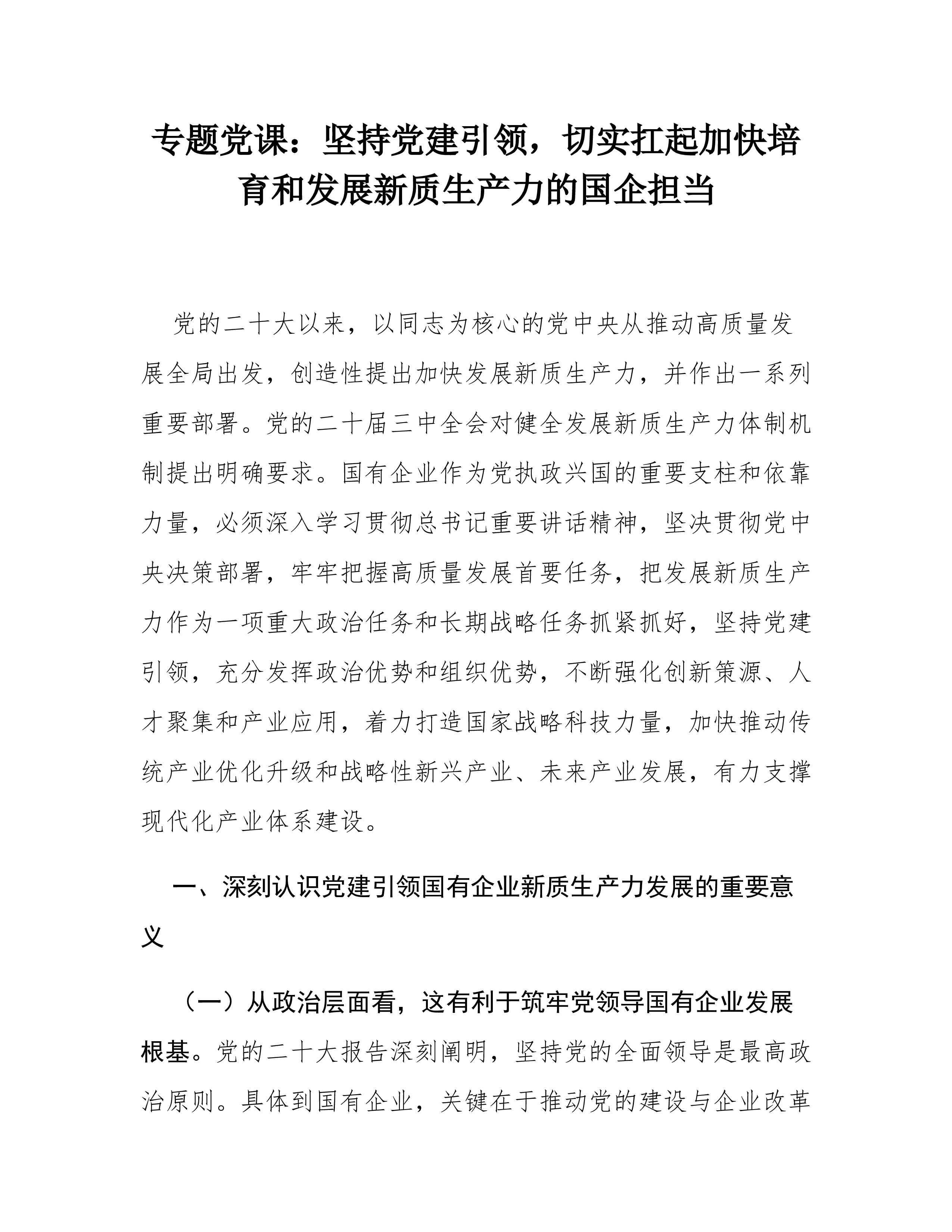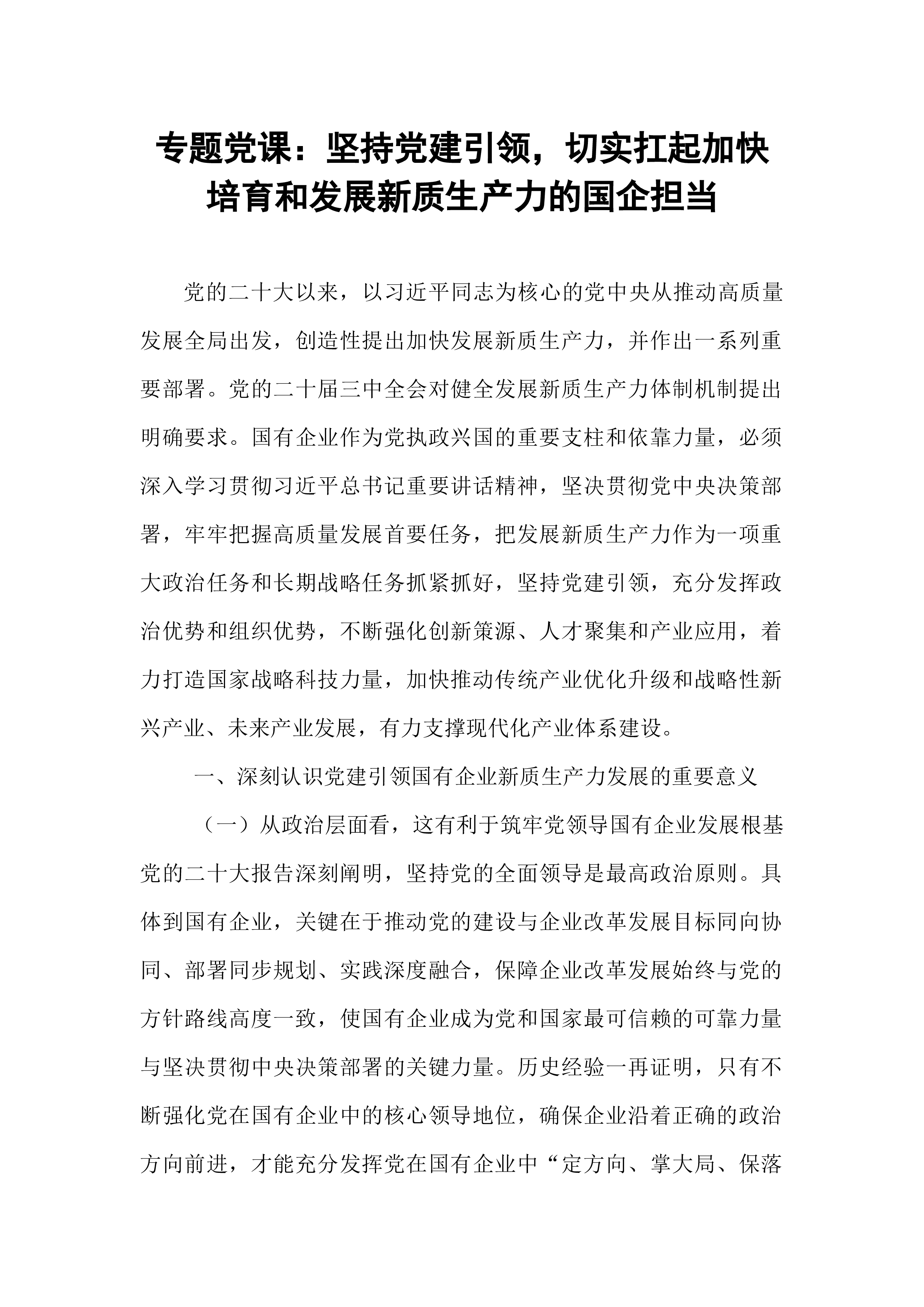 专题党课:坚持党建引领,切实扛起加快培育和发展新质生产力的国企担当党的二十大以来,以习近平同志为核心的党中央从推动高质量发展全局出发,创造性提出加快发展新质生产力,并作出一系列重要部署。党的二十届三中全会对健全发展新质生产力体制机制提出明确要求。国有企业作为党执政兴国的重要支柱和依靠力量,必须深入学习贯彻习近平总书记重要讲话精神,坚决贯彻党中央决策部署,牢牢把握高质量发展首要任务,把发展新质生产力作为一项重大政治任务和长期战略任务抓紧抓好,坚持党建引领,充分发挥政治优势和组织优势,不断强化创新策源、人才聚集和产业应用,着力打造国家战略科技力量,加快推动传统产业优化升级和战略性新兴产业、未来产业发展,有力支撑现代化产业体系建设。一、深刻认识党建引领国有企业新质生产力发展的重要意义(一)从政治层...