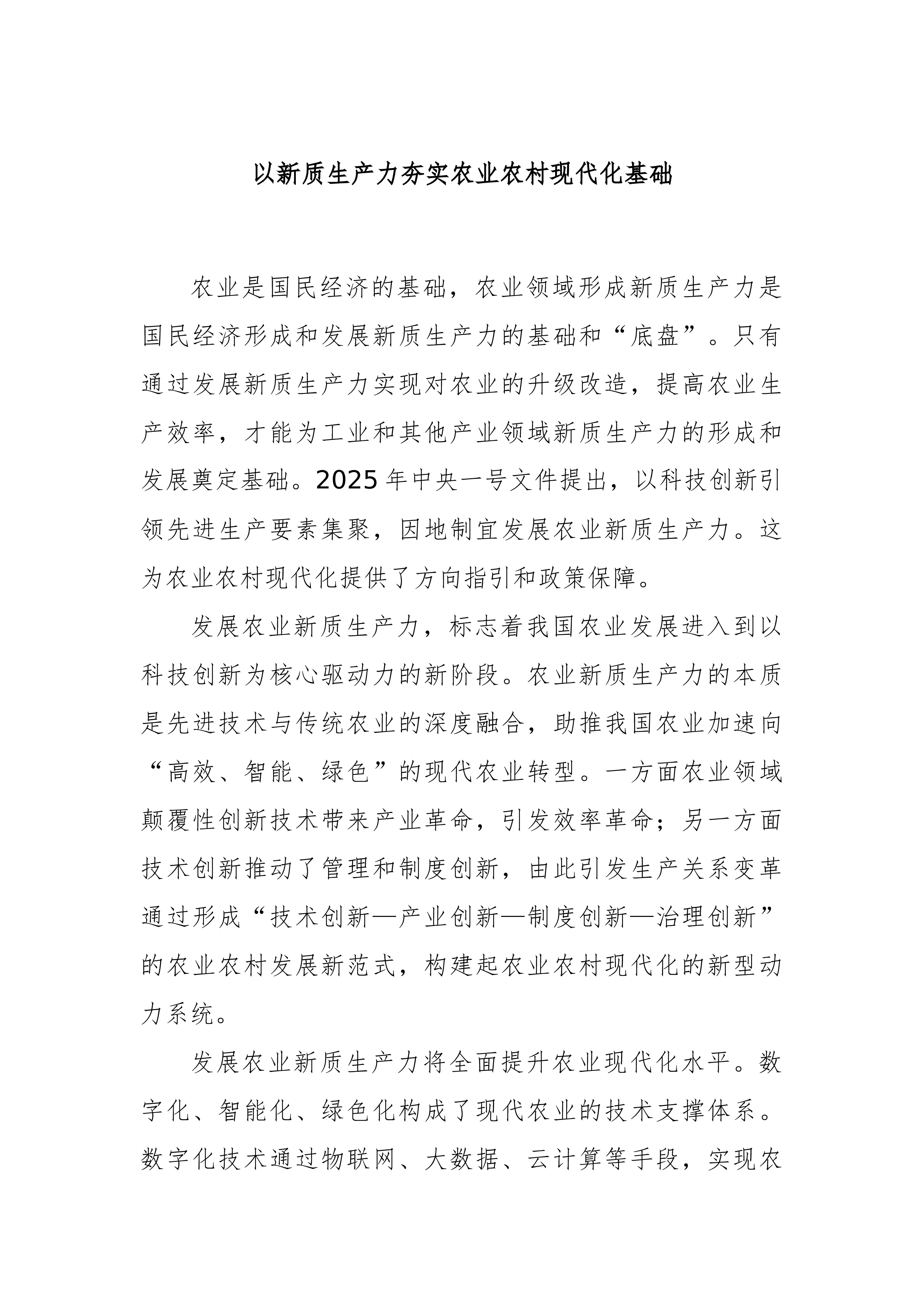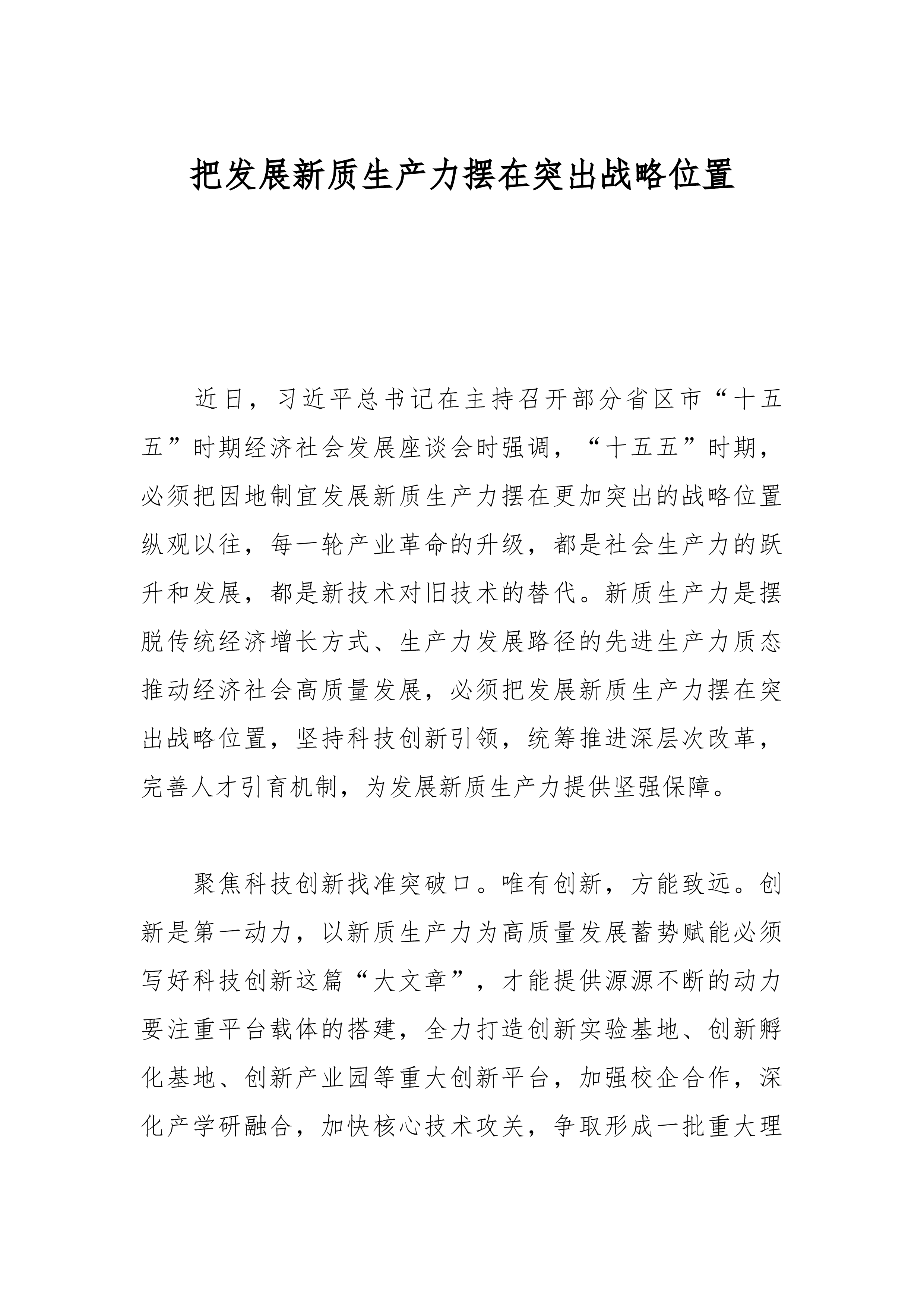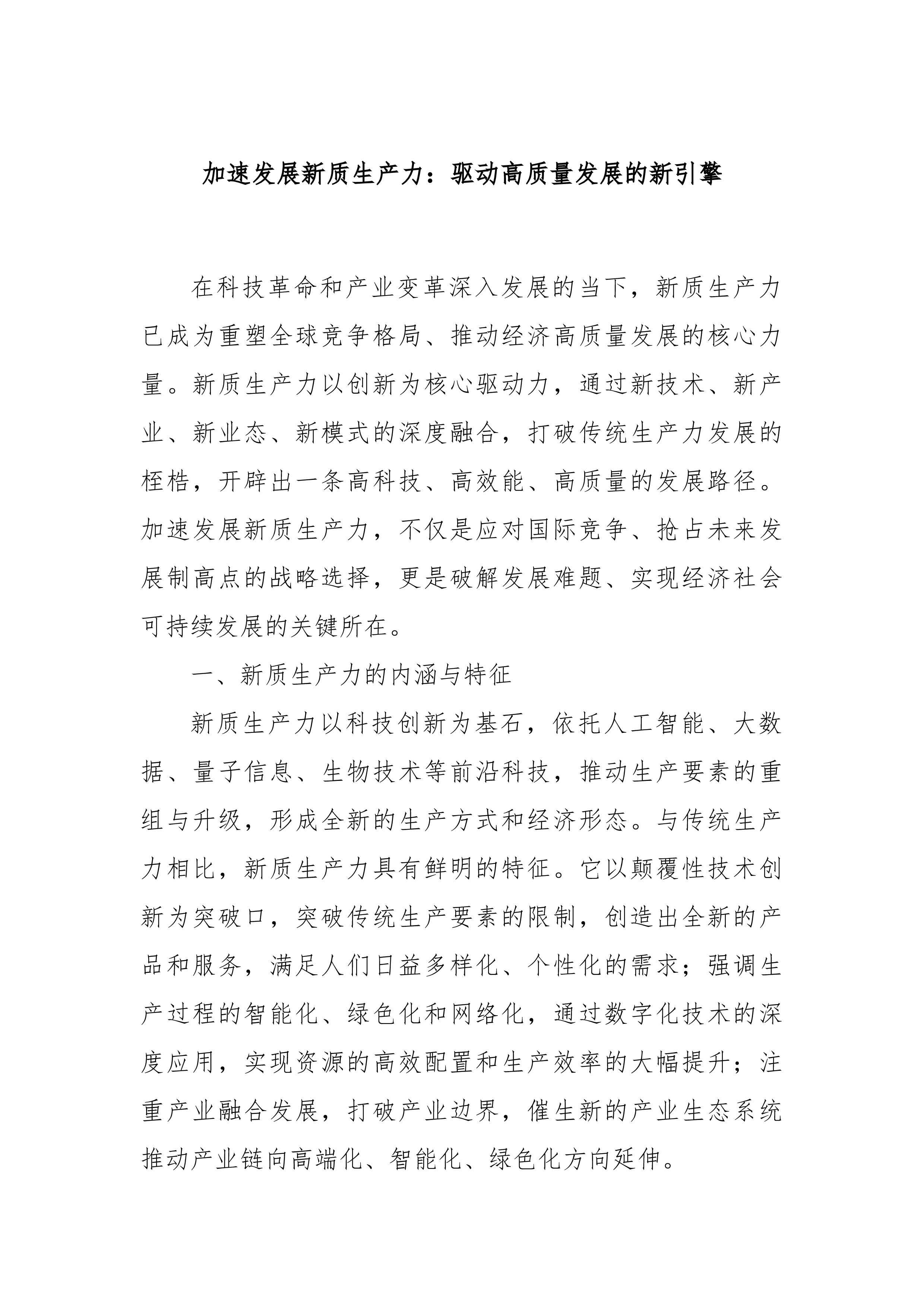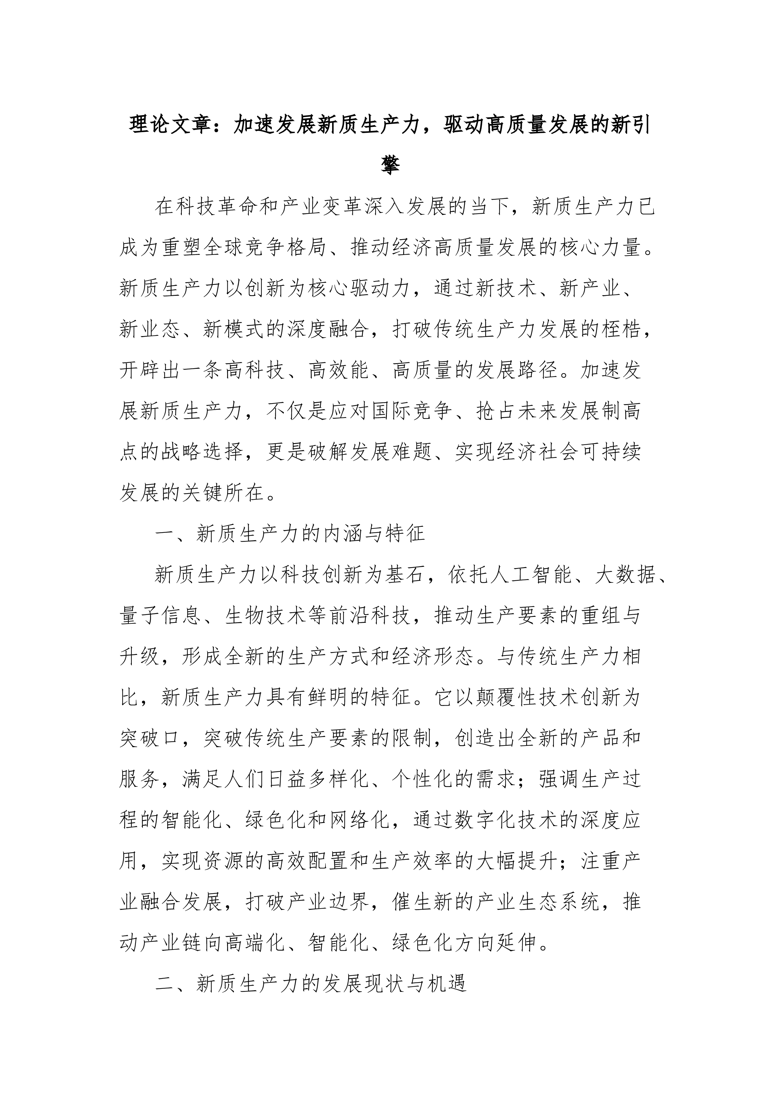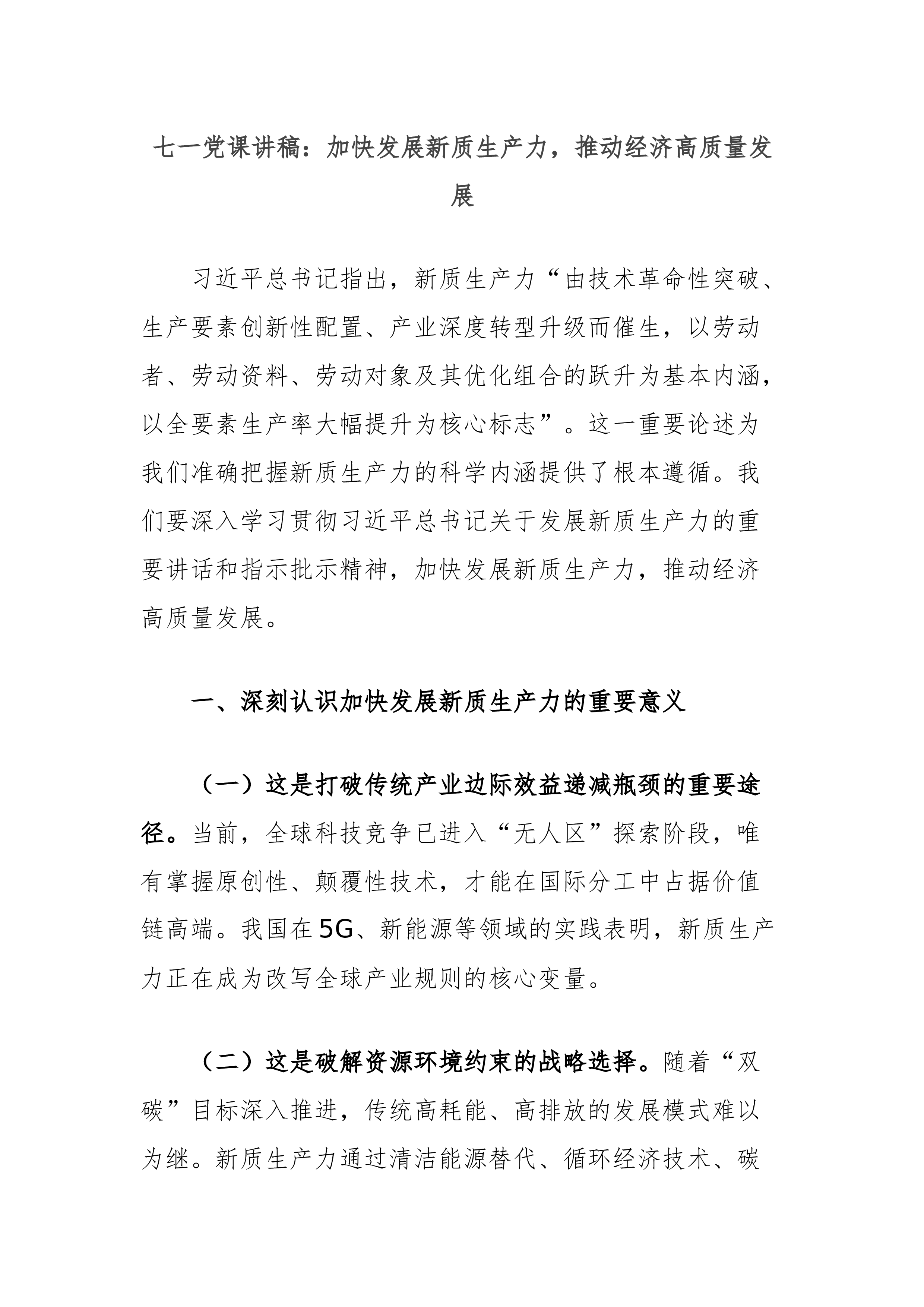 专题党课:坚持党建引领,切实扛起加快培育和发展新质生产力的国企担当党的二十大以来,以习近平同志为核心的党中央从推动高质量发展全局出发,创造性提出加快发展新质生产力,并作出一系列重要部署。党的二十届三中全会对健全发展新质生产力体制机制提出明确要求。国有企业作为党执政兴国的重要支柱和依靠力量,必须深入学习贯彻习近平总书记重要讲话精神,坚决贯彻党中央决策部署,牢牢把握高质量发展首要任务,把发展新质生产力作为一项重大政治任务和长期战略任务抓紧抓好,坚持党建引领,充分发挥政治优势和组织优势,不断强化创新策源、人才聚集和产业应用,着力打造国家战略科技力量,加快推动传统产业优化升级和战略性新兴产业、未来产业发展,有力支撑现代化产业体系建设。一、深刻认识党建引领国有企业新质生产力发展的重要意义(一)从政治层...