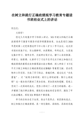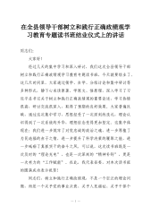 在全县领导干部树立和践行正确政绩观学习教育专题读书班结业仪式上的讲话同志们:大家好!经过几天的集中学习和深入研讨,我们这次全县领导干部树立和践行正确政绩观学习教育专题读书班,今天就要结业了。这几天时间里,大家通过领学、自学、分组讨论和集中研讨等多种形式,静下心来读原著、学原文、悟原理,深入学习了习近平总书记关于树立和践行正确政绩观的重要论述,学习热情很高,研讨交流很深入,取得了预期的良好效果。大家普遍反映,通过这次集中学习,思想经受了一次深刻的洗礼,理论认识得到了一次系统的升华,理想信念变得更加坚定。这集中体现在:我们进一步筑牢了对党忠诚的政治之魂,进一步厚植了为民造福的赤子之情,进一步提升了科学决策的履职之能,进一步砥砺了真抓实干的奋斗之风。可以说,这次读书班既是一次及时的“理论充电”,也...