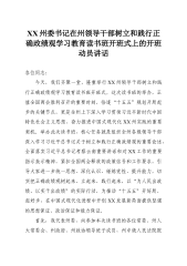 XX州委书记在州领导干部树立和践行正确政绩观学习教育读书班开班式上的开班动员讲话各位同志:今天,我们齐聚一堂,隆重举行XX州领导干部树立和践行正确政绩观学习教育读书班开班式。这次读书班的举办,正值全国两会胜利召开的重要时刻,恰逢“十五五”规划开局起步的关键节点,更是全州上下深入学习贯彻习近平新时代中国特色社会主义思想、奋力推进中国式现代化XX州实践的重要契机。举办此次读书班,核心任务就是组织全州各级领导干部深入学习习近平总书记关于树立和践行正确政绩观的重要论述,全面落实习近平总书记考察云南重要讲话和对XX工作的重要指示批示精神,紧扣全国两会释放的政策信号和工作要求,引导大家进一步统一思想、深化认识、锤炼党性、提升能力,切实把正确政绩观树起来、立起来、践行起来,以“为人民出政绩、以实干出政绩”...