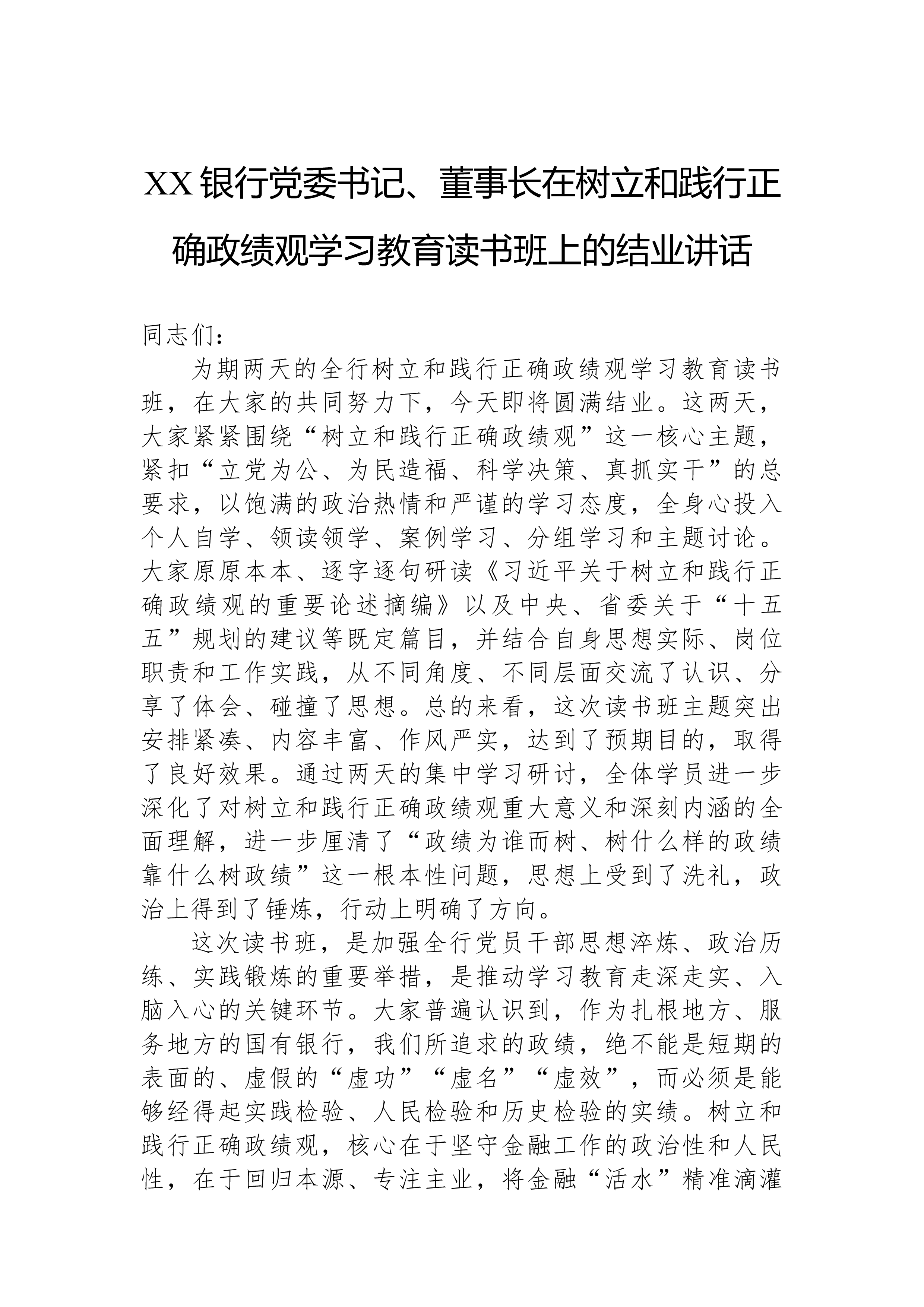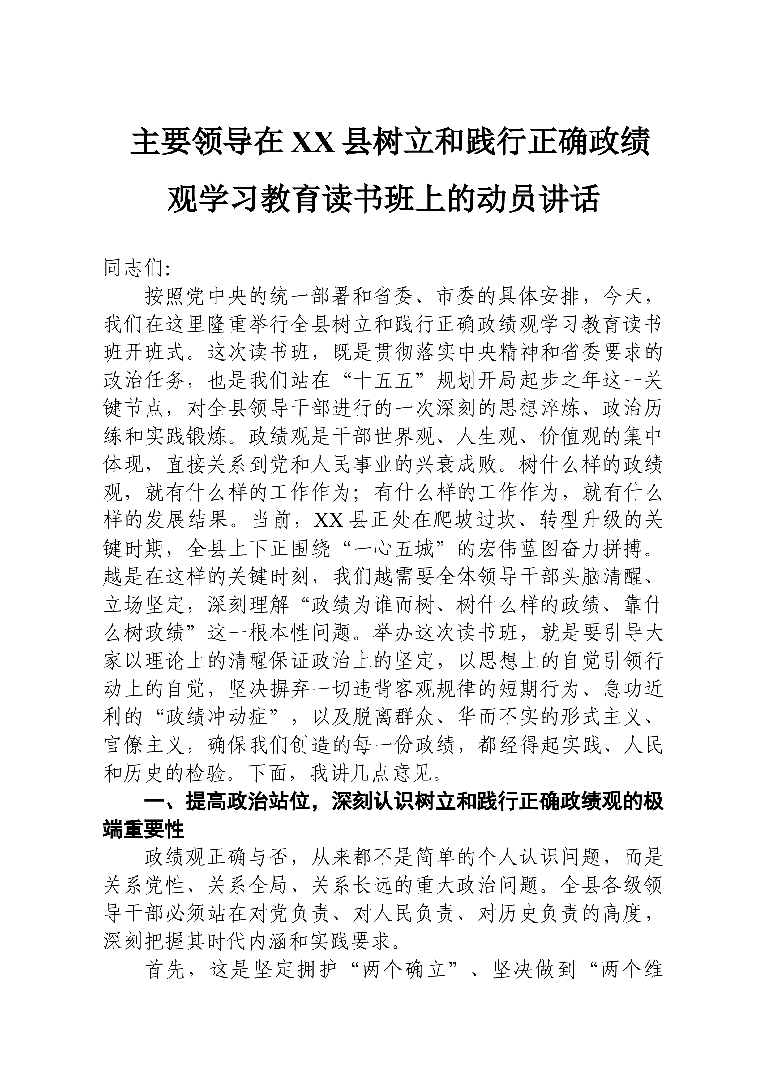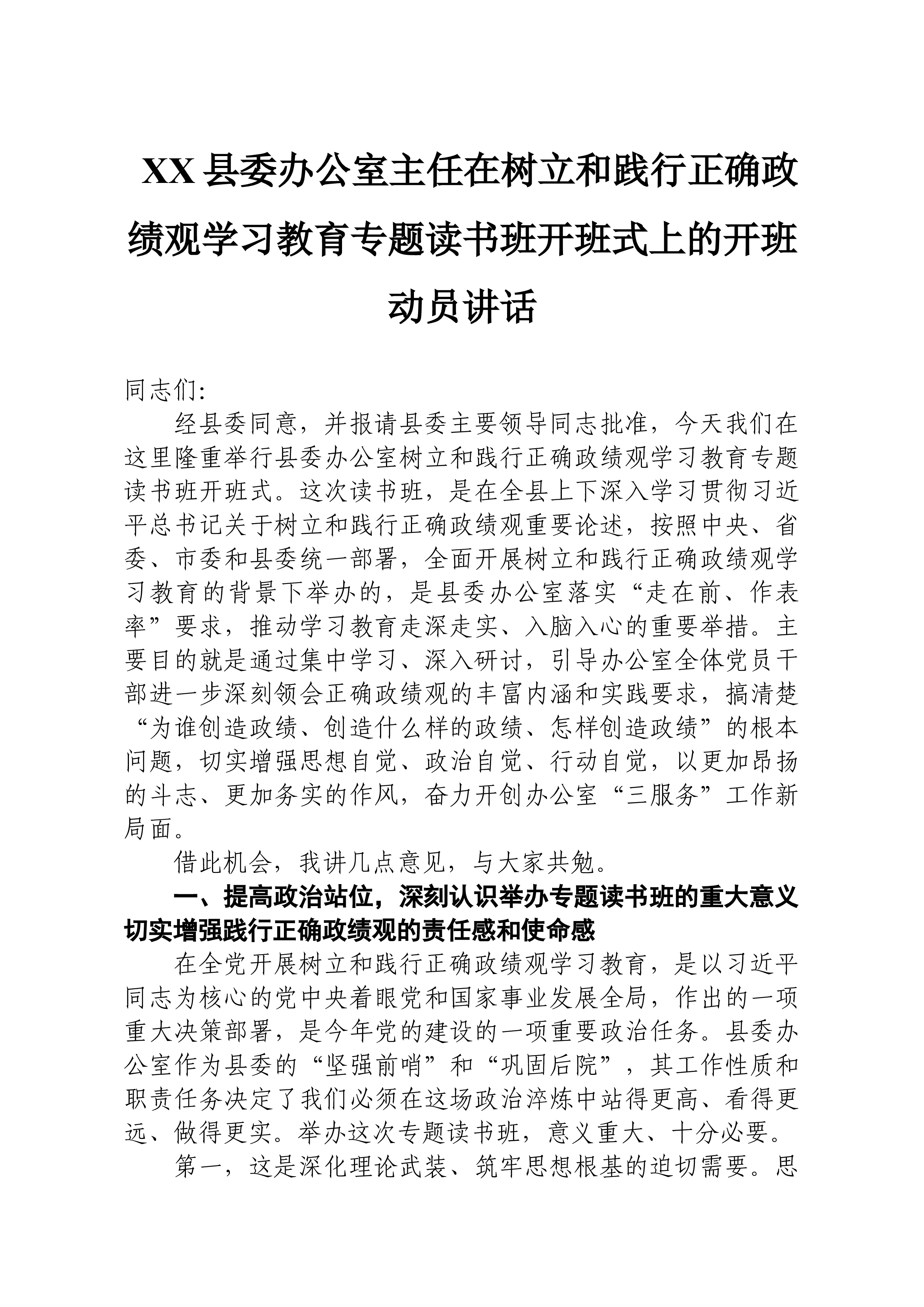 XX县委办公室主任在树立和践行正确政绩观学习教育专题读书班开班式上的开班动员讲话同志们:经县委同意,并报请县委主要领导同志批准,今天我们在这里隆重举行县委办公室树立和践行正确政绩观学习教育专题读书班开班式。这次读书班,是在全县上下深入学习贯彻习近平总书记关于树立和践行正确政绩观重要论述,按照中央、省委、市委和县委统一部署,全面开展树立和践行正确政绩观学习教育的背景下举办的,是县委办公室落实“走在前、作表率”要求,推动学习教育走深走实、入脑入心的重要举措。主要目的就是通过集中学习、深入研讨,引导办公室全体党员干部进一步深刻领会正确政绩观的丰富内涵和实践要求,搞清楚“为谁创造政绩、创造什么样的政绩、怎样创造政绩”的根本问题,切实增强思想自觉、政治自觉、行动自觉,以更加昂扬的斗志、更加务实的作风,...