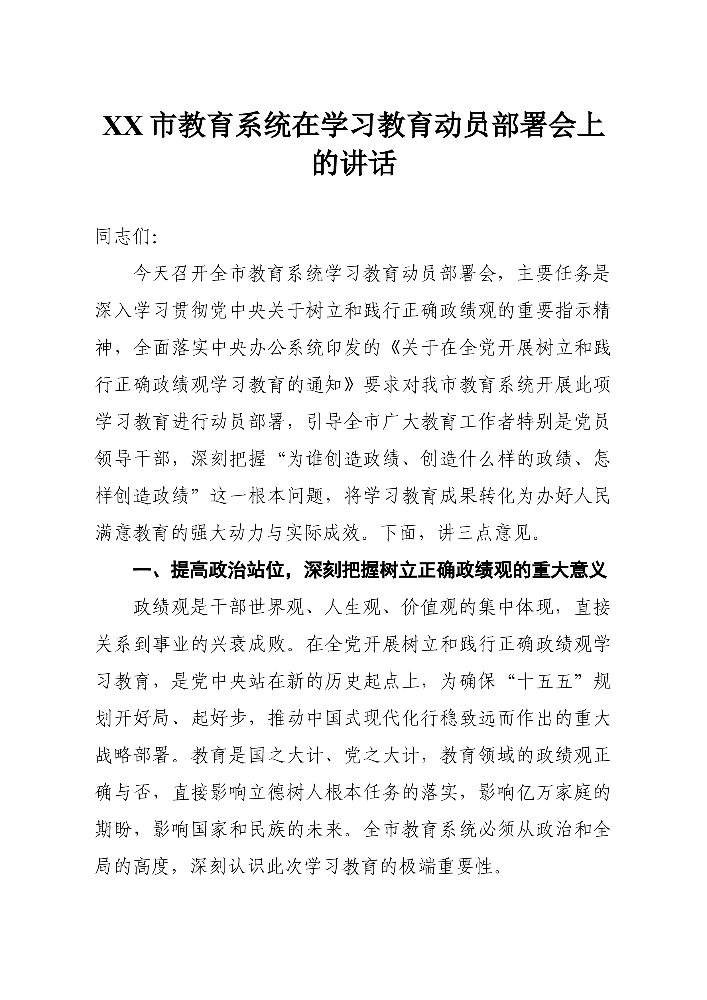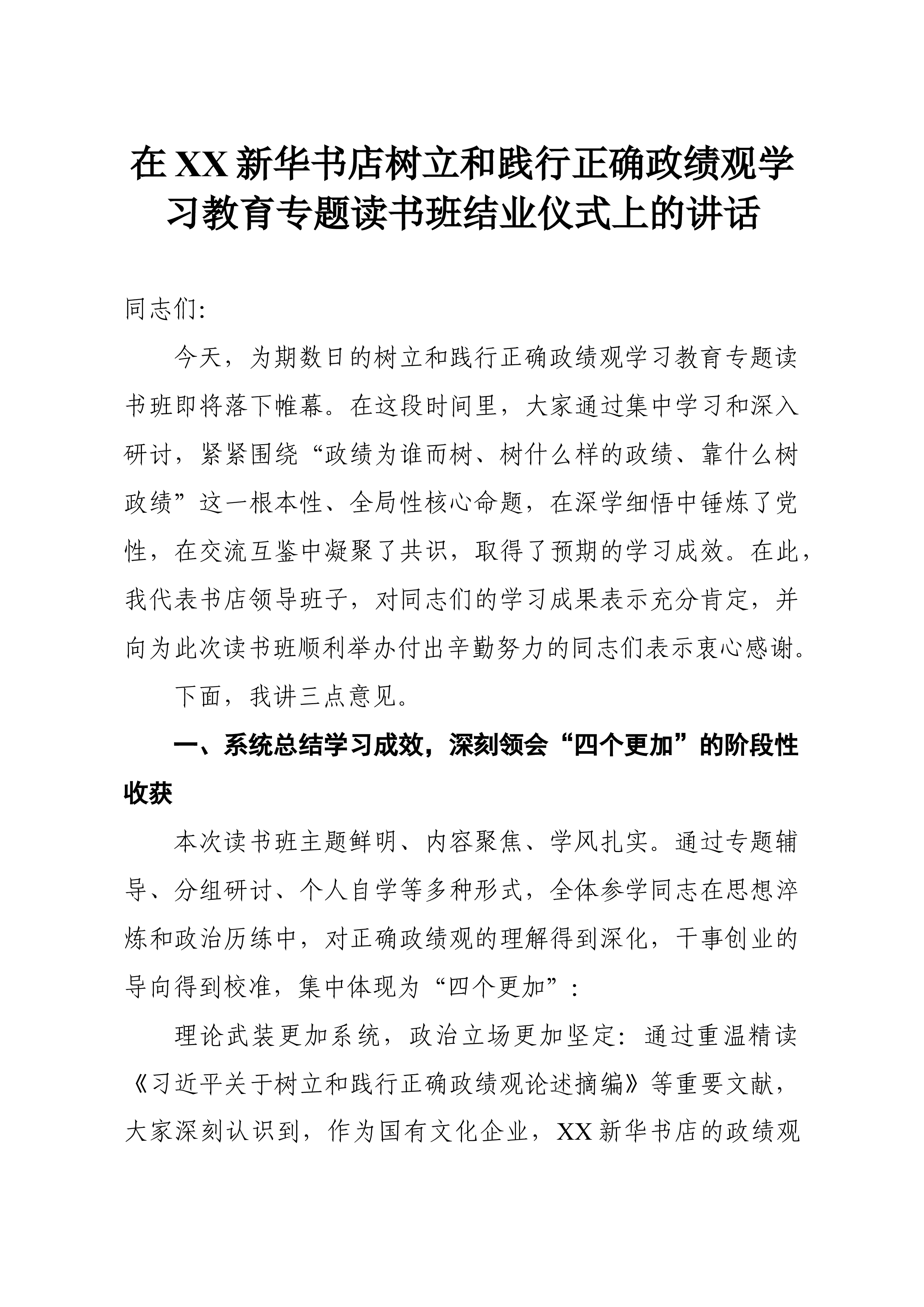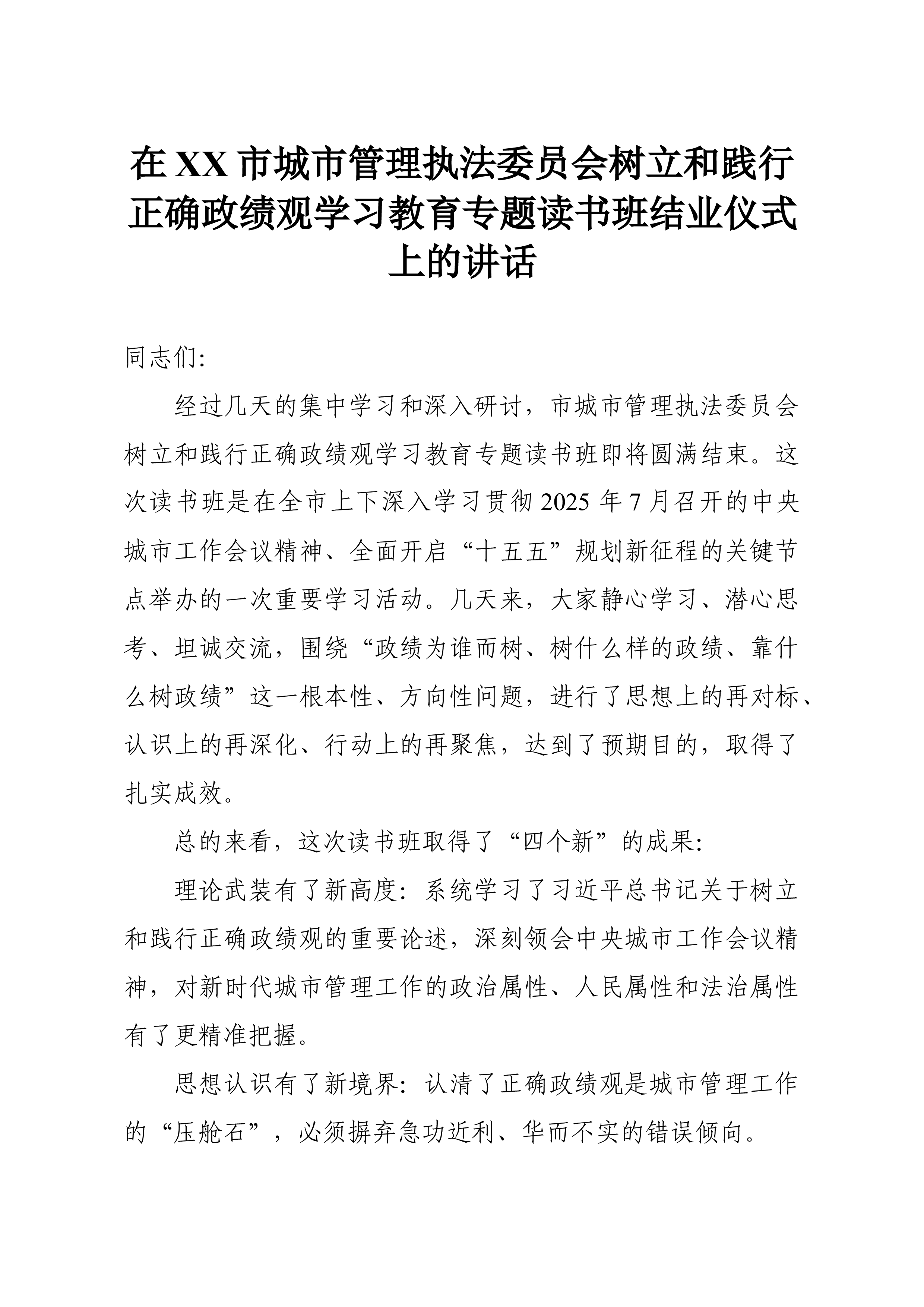 在XX市城市管理执法委员会树立和践行正确政绩观学习教育专题读书班结业仪式上的讲话同志们:经过几天的集中学习和深入研讨,市城市管理执法委员会树立和践行正确政绩观学习教育专题读书班即将圆满结束。这次读书班是在全市上下深入学习贯彻2025 年7月召开的中央城市工作会议精神、全面开启“十五五”规划新征程的关键节点举办的一次重要学习活动。几天来,大家静心学习、潜心思考、坦诚交流,围绕“政绩为谁而树、树什么样的政绩、靠什么树政绩”这一根本性、方向性问题,进行了思想上的再对标、认识上的再深化、行动上的再聚焦,达到了预期目的,取得了扎实成效。总的来看,这次读书班取得了“四个新”的成果:理论武装有了新高度:系统学习了习近平总书记关于树立和践行正确政绩观的重要论述,深刻领会中央城市工作会议精神,对新时代城市管理...