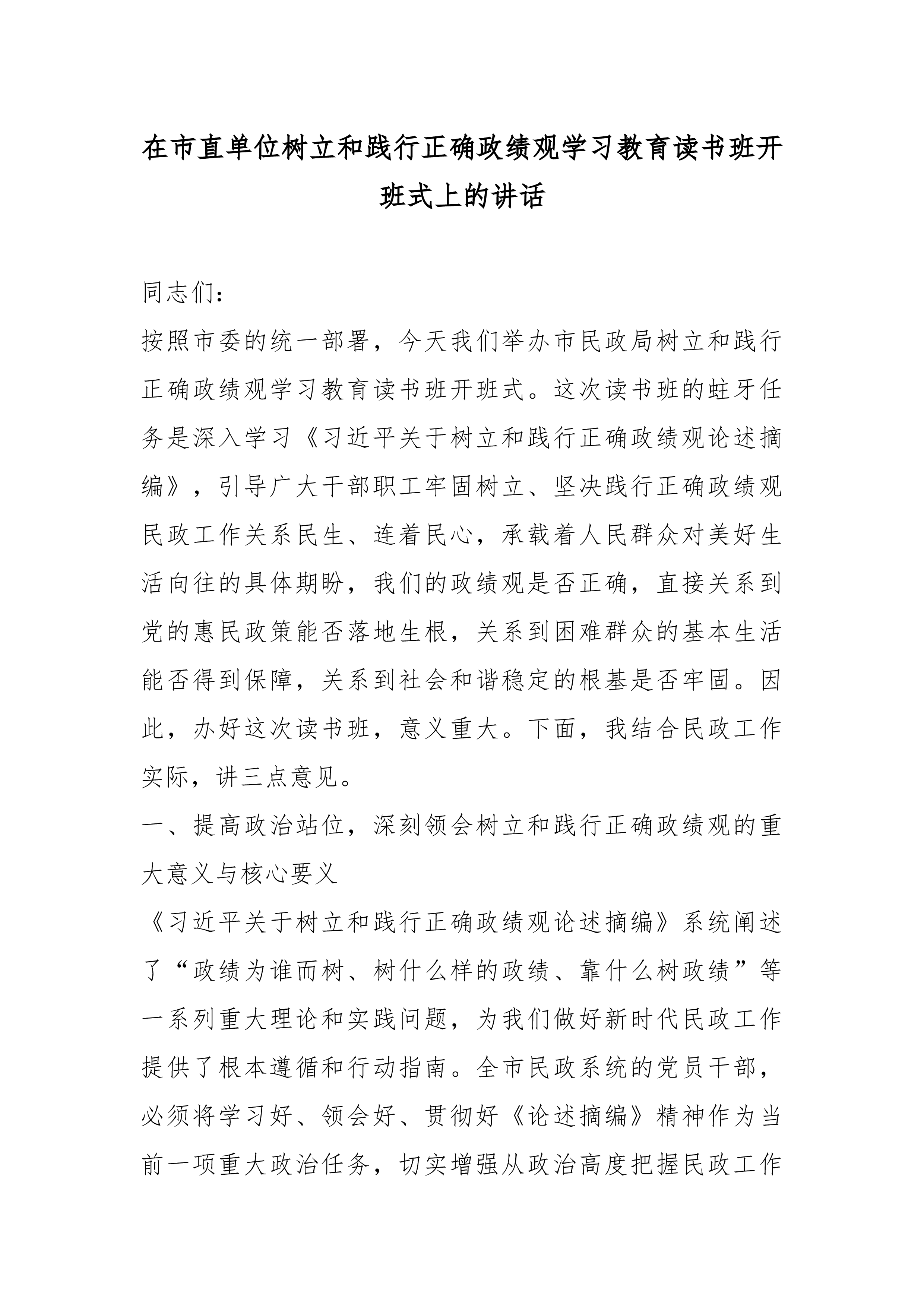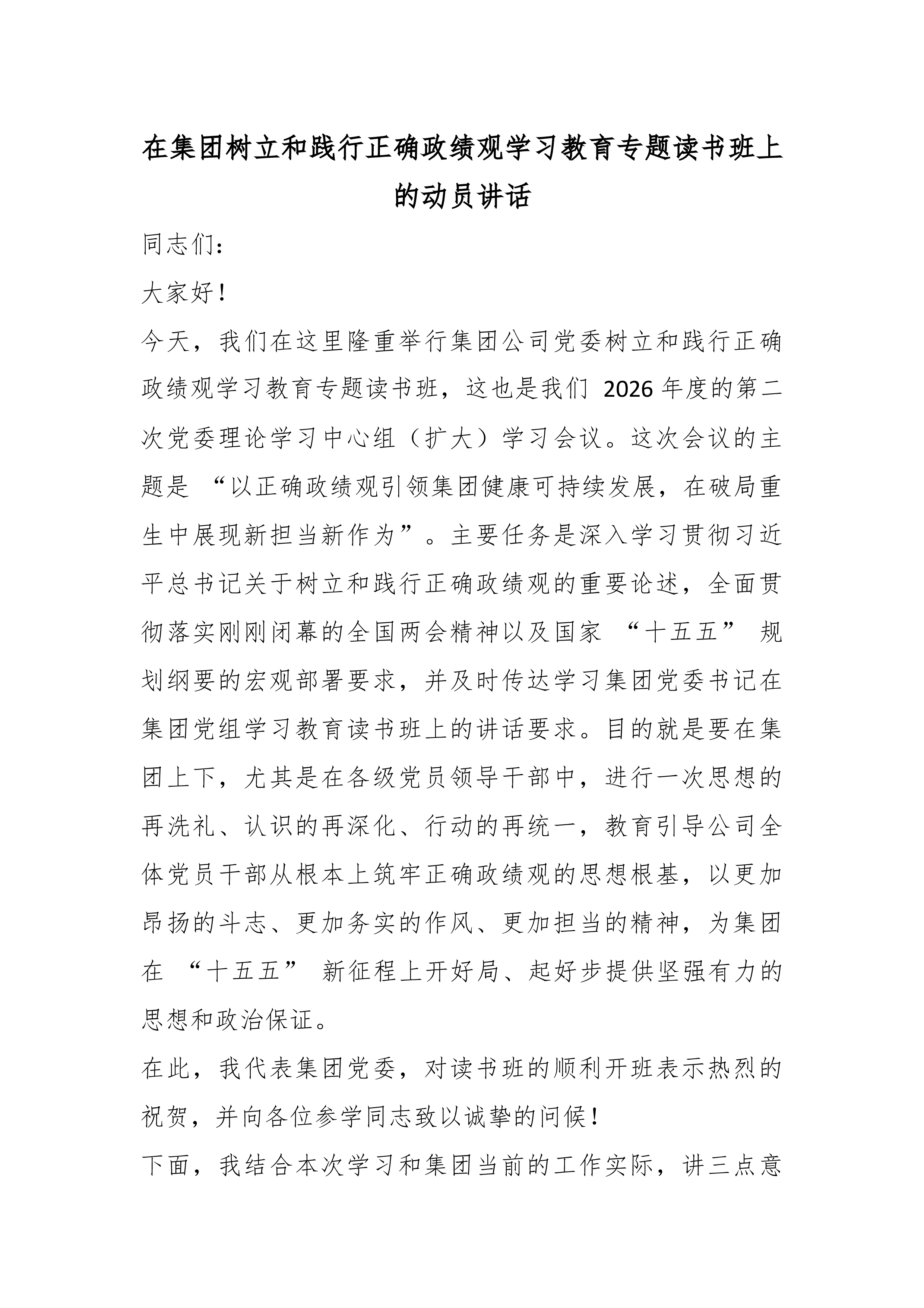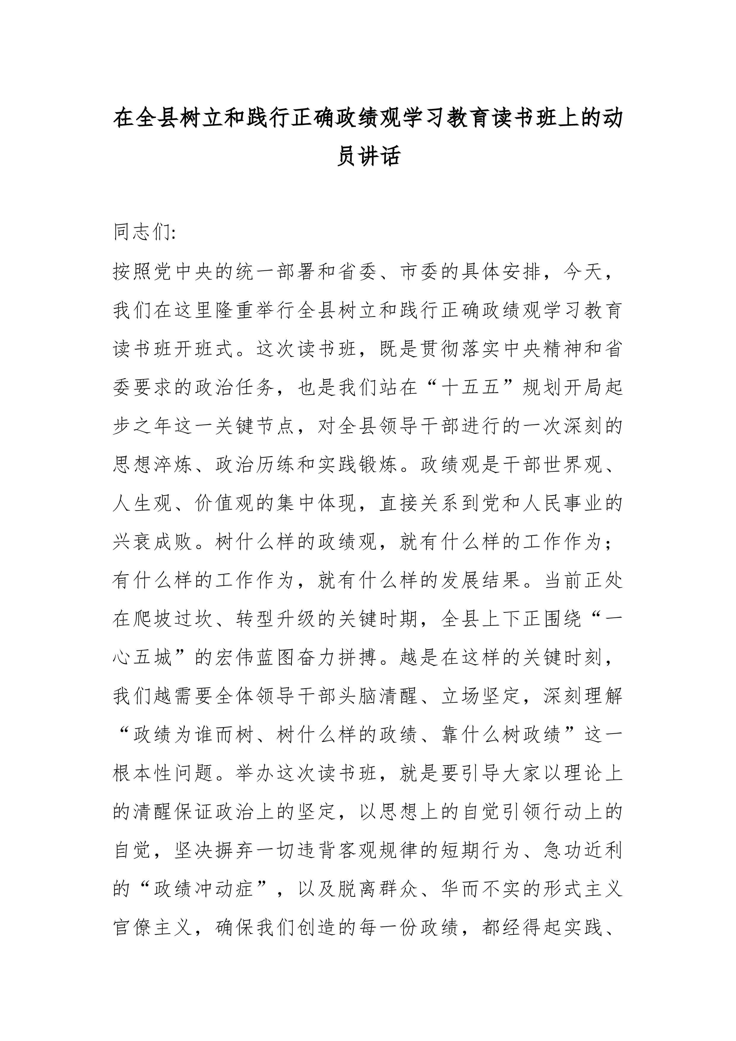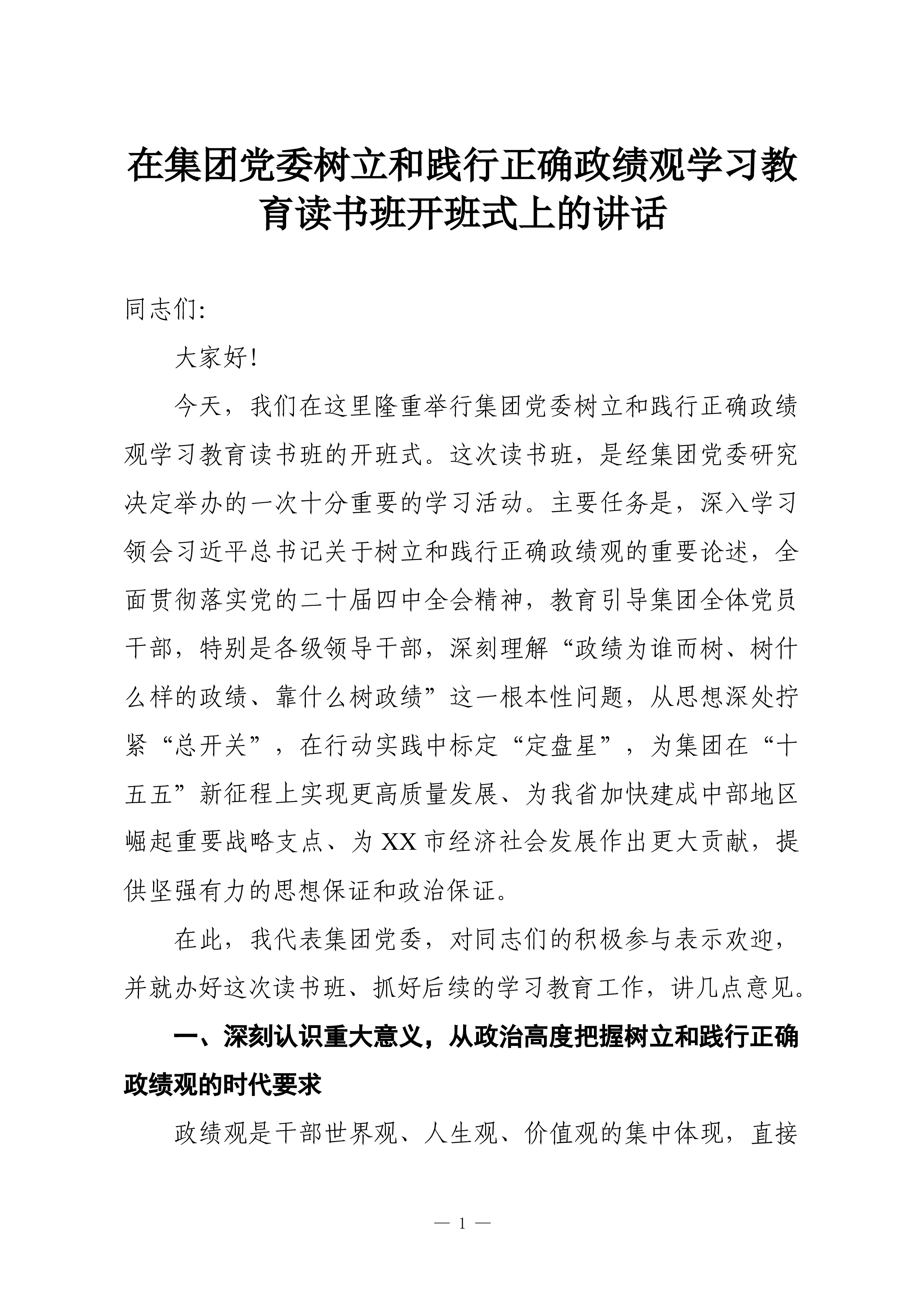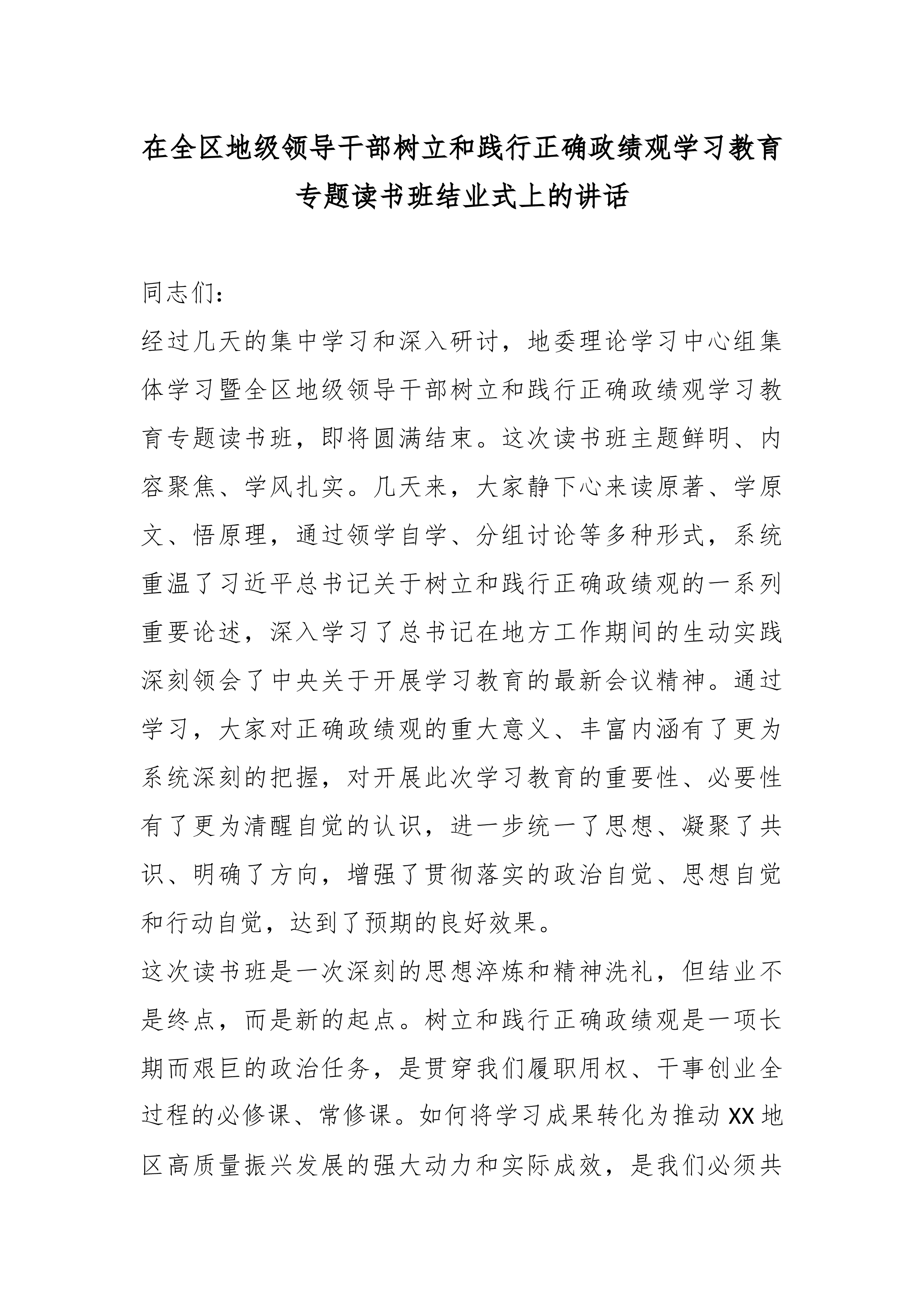 在全区地级领导干部树立和践行正确政绩观学习教育专题读书班结业式上的讲话同志们:经过几天的集中学习和深入研讨,地委理论学习中心组集体学习暨全区地级领导干部树立和践行正确政绩观学习教育专题读书班,即将圆满结束。这次读书班主题鲜明、内容聚焦、学风扎实。几天来,大家静下心来读原著、学原文、悟原理,通过领学自学、分组讨论等多种形式,系统重温了习近平总书记关于树立和践行正确政绩观的一系列重要论述,深入学习了总书记在地方工作期间的生动实践深刻领会了中央关于开展学习教育的最新会议精神。通过学习,大家对正确政绩观的重大意义、丰富内涵有了更为系统深刻的把握,对开展此次学习教育的重要性、必要性有了更为清醒自觉的认识,进一步统一了思想、凝聚了共识、明确了方向,增强了贯彻落实的政治自觉、思想自觉和行动自觉,达到了预期...