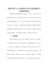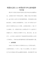 市人大办公室机关2025年党组理论学习中心组专题学习计划参考范文为深入学习贯彻习近平新时代中国特色社会主义思想,加强XX市人大办公室党组理论学习中心组的学习,提高领导干部的政治理论水平和领导能力,根据市委有关要求,结合市人大办公室工作实际,制定2025年党组理论学习中心组专题学习计划。一、指导思想坚持以习近平新时代中国特色社会主义思想为指导,全面贯彻党的二十大和二十届三中全会精神,深入落实习近平总书记关于坚持和完善人民代表大会制度的重要思想,深刻领悟"两个确立"的决定性意义,增强"四个意识"、坚定"四个自信"、做到"两个维护"。紧紧围绕市委中心工作和市人大常委会重点任务,以学习贯彻党的创新理论...