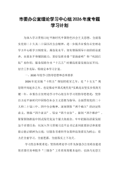 XX市财政局党组理论学习中心组2026年度学习计划(精品)2026年是全面贯彻落实“十五五”规划的开局之年,财政改革发展任务艰巨繁重。为持续加强局党组理论学习中心组思想政治建设,提升领导班子和领导干部运用党的创新理论指导实践、破解难题、推动发展的能力,切实将学习成果转化为服务全市经济社会高质量发展的强大动力和实际成效,结合我市财政工作实际,制定本学习计划。一、指导思想坚持以新时代中国特色社会主义思想为指导,全面贯彻党的基本理论、基本路线、基本方略,深入学习贯彻中央经济工作会议精神和全国财政工作会议部署,紧紧围绕“十五五”时期经济社会发展主要目标和2026年重点任务,聚焦财政主责主业,坚持学思用贯通、知信行统一。以政治学习为根本,以提升履职能力为重点,以解决实际问题为导向,不断提高中心组成员的...