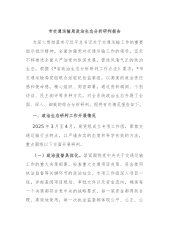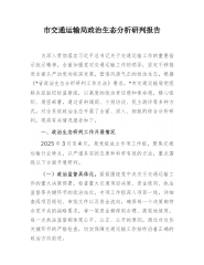 市交通运输局政治生态分析研判报告为深入贯彻落实习近平总书记关于交通运输工作的重要指示批示精神,全面加强党对交通运输工作的领导,坚定不移推进全面从严治党向纵深发展,营造风清气正的政治生态,根据《*省政治生态分析研判工作办法》要求,*市交通运输局党组联合派驻纪检监察组,以高度的政治责任感和使命感,精心组织、周密部署,通过资料调阅、个别访谈、民主测评等多种方式,对全系统政治生态开展了全面、深入、细致的综合分析研判。现将有关情况报告如下。一、政治生态研判工作开展情况2025年3月至4月,局党组成立专项工作组,聚焦交通运输行业特点,以严谨务实的态度和科学有效的方法,重点围绕以下方面开展研判。(一)政治监督具体化。紧紧围绕党中央关于交通运输工作的重大决策部署,检查重大交通项目决策、资金使用执法监督等关键...