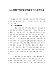 某市教育局2024年第三季度意识形态工作分析研判报告意识形态工作是党的一项极端重要的工作,关乎旗帜、关乎道路、关乎国家政治安全。教育系统作为意识形态工作的重要阵地,肩负着培养德智体美劳全面发展的社会主义建设者和接班人的重大任务。2024年第三季度,某市教育局在市委、市政府的正确领导下,紧紧围绕教育中心工作,切实加强意识形态领域管理和引导,确保了教育系统意识形态安全。本报告对某市教育局2024年第三季度意识形态工作进行深入分析研判,总结经验做法,查找问题不足,提出改进措施,为进一步做好教育系统意识形态工作提供参考。一、2024年第三季度意识形态工作开展情况(一)加强组织领导,压实工作责任某市教育...