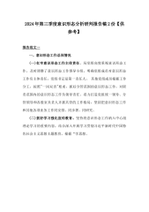 2024年公司上半年政治生态情况分析研判报告与2024年政治生态分析研判情况报告【2份】供参考2024年公司上半年政治生态情况分析研判报告2024年上半年,集团党委坚持以习近平新时代中国特色社会主义思想为指导,全面贯彻落实党的二十大和二十届二中全会精神精神,围绕中心大局,立足职能职责,全面推进党的建设各项工作赋能提优,持续巩固发展良好政治生态。现将上半年政治生态情况分析研判如下:一、主要工作开展情况(一)“三个抓手”强化政治建设。延伸政治统领“机制链”。严格落实“第一议题”制度,把政治统领贯彻到党委、党支部、工会等各级党组织和群团组织决策部署全过程,将“两个维护”体现到推动中心工作各环节。严格...