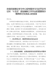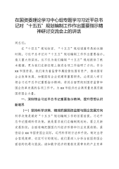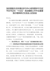 发改委副主任在理论学习中心组专题学习习近平总书记对“十五五”规划编制工作作出重要指示精神研讨交流会上的发言同志们:在全面落实党的XX大战略部署、推进中国式现代化的关键时期,习近平总书记对“十五五”规划编制工作作出重要指示,为我们指明了方向、提供了根本遵循。“十五五”规划编制工作,关乎国家发展全局,也与我们XX这座城市的未来息息相关。作为XX市发展和改革委员会的一员,我们肩负着重大使命,必须深入学习领会习近平总书记重要指示精神,结合我们的工作职责,以更高的站位、更宽的视野、更实的举措,为编制高质量的“十五五”规划贡献智慧和力量。下面,我谈几点体会,与大家共同交流。一、深化思想认识,领悟“十五五”规划编制的重大意义(一)深刻领会科学制定和接续实施五年规划的政治优势科学制定和接续实施五年规划,是我...