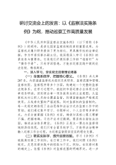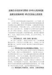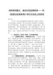 在学习贯彻《中华人民共和国监察法实施条例》研讨交流会上的发言:学深悟透条例精神,推动巡察工作高质量发展同志们:《中华人民共和国监察法实施条例》(以下简称《条例》)的颁布实施,是深化国家监察体制改革的重要成果为纪检监察机关履行职责、行使权力提供了重要遵循。作为市委巡察办一名领导干部,我深感责任重大、使命光荣下面,结合自身工作职责,围绕学习贯彻《条例》,谈几点体会。一、深化理解,精准把握条例要义《条例》的出台,进一步细化了监察法的相关规定,对监察工作的各个环节进行了全面规范。深刻理解《条例》精神,是我们准确履行职责的基础。(一)明确监察工作政治定位。习近平总书记强调,要强化政治监督,确保党中央重大决策部署贯彻落实到位《条例》开篇即明确坚持中国共产党对监察工作的全面领导,这一规定凸显了监察工作的政...