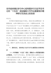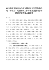 在市政府理论学习中心组专题学习习近平总书记对“十五五”规划编制工作作出重要指示精神研讨交流会上的发言同志们:科学制定和接续实施五年规划,是我们党治国理政的一条重要经验,也是中国特色社会主义的一个重要政治优势。习近平总书记近日对“十五五”规划编制工作作出重要指示,强调要坚持科学决策、民主决策、依法决策,把顶层设计和问计于民统一起来,高质量完成规划编制工作。这一重要指示,为我们做好“十五五”规划编制工作提供了根本遵循。我们要认真学习领会,切实把思想和行动统一到习近平总书记重要指示精神上来,以高度的政治责任感和使命感,高质量完成“十五五”规划编制任务,为推进中国式现代化xx实践奠定坚实基础。下面,围绕中心组研讨交流主题,我谈几点体会,以供同志们参考。一、提高站位,深刻领会习近平总书记重要指示的精神...