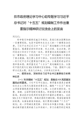 在市政府理论学习中心组专题学习习近平总书记对“十五五”规划编制工作作出重要指示精神研讨交流会上的发言同志们:科学制定和接续实施五年规划,是我们党治国理政的一条重要经验,也是中国特色社会主义的一个重要政治优势。习近平总书记近日对“十五五”规划编制工作作出重要指示,强调要坚持科学决策、民主决策、依法决策,把顶层设计和问计于民统一起来,高质量完成规划编制工作这一重要指示,为我们做好“十五五”规划编制工作提供了根本遵循。我们要认真学习领会,切实把思想和行动统一到习近平总书记重要指示精神上来,以高度的政治责任感和使命感,高质量完成“十五五”规划编制任务,为推进中国式现代化XX实践奠定坚实基础。下面,围绕中心组研讨交流主题,我谈几点体会,以供同志们参考。一、提高站位,深刻领会习近平总书记重要指示的精神实...