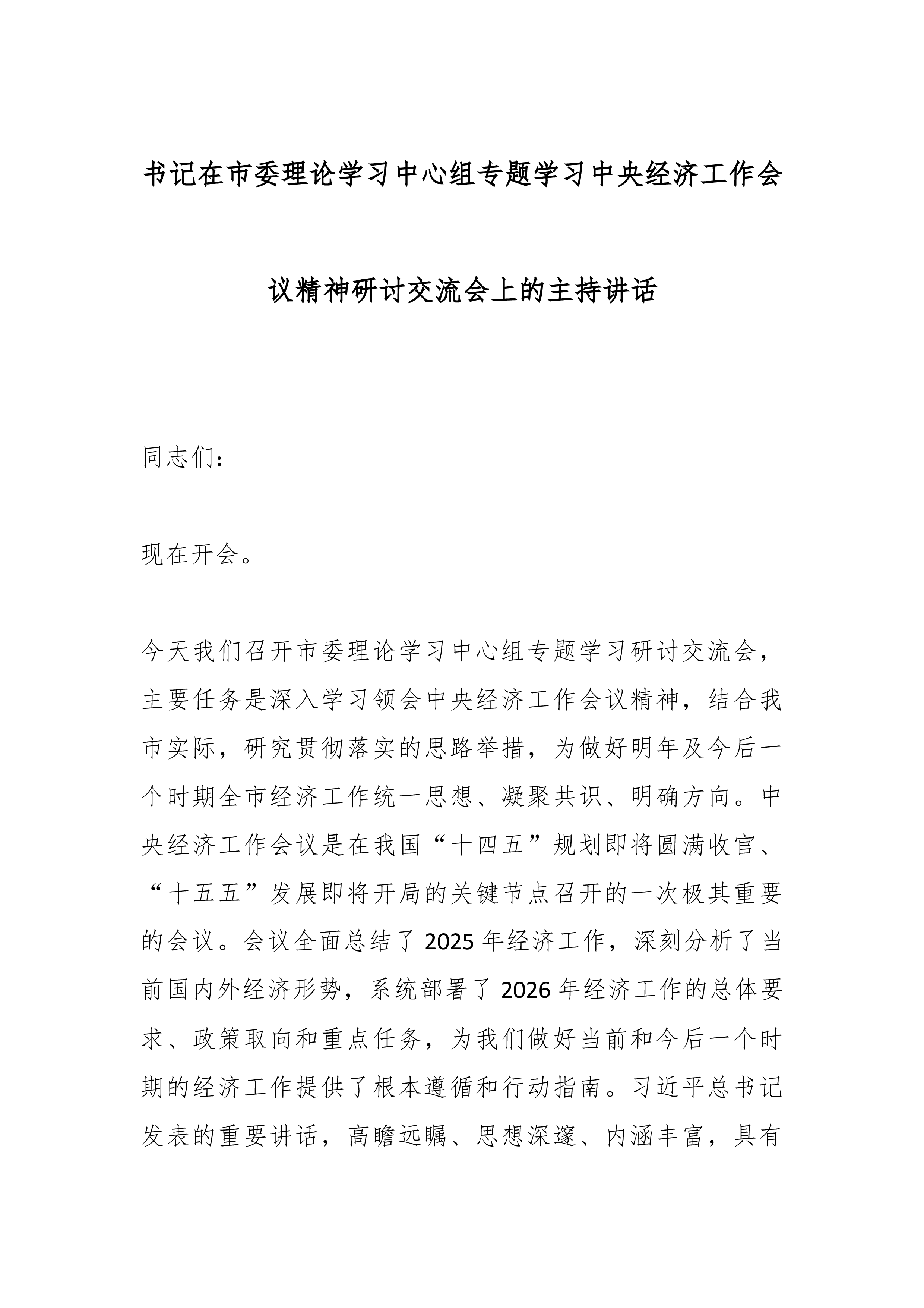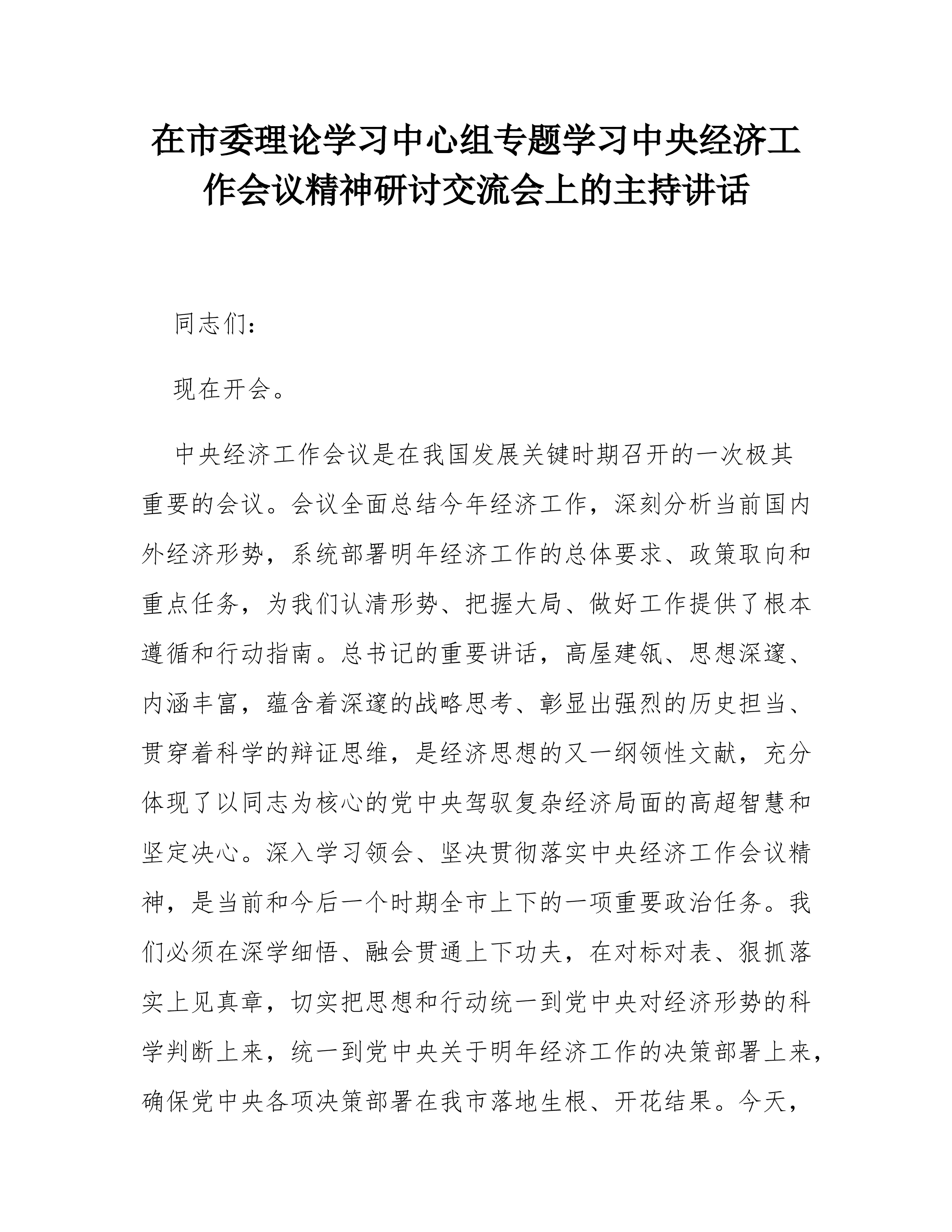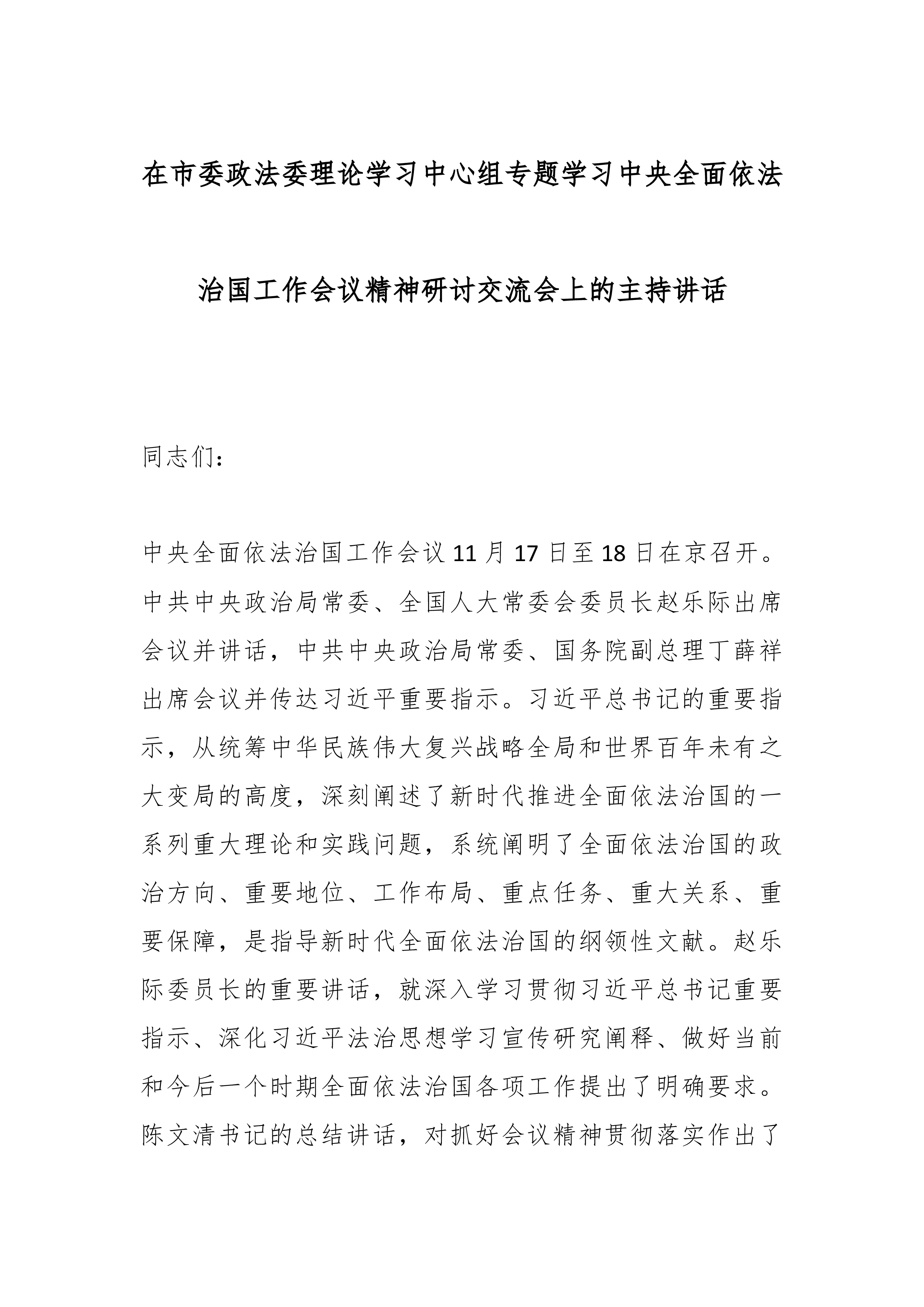在市委政法委理论学习中心组专题学习中央全面依法治国工作会议精神研讨交流会上的主持讲话同志们:中央全面依法治国工作会议11月17日至18日在京召开。中共中央政治局常委、全国人大常委会委员长赵乐际出席会议并讲话,中共中央政治局常委、国务院副总理丁薛祥出席会议并传达习近平重要指示。习近平总书记的重要指示,从统筹中华民族伟大复兴战略全局和世界百年未有之大变局的高度,深刻阐述了新时代推进全面依法治国的一系列重大理论和实践问题,系统阐明了全面依法治国的政治方向、重要地位、工作布局、重点任务、重大关系、重要保障,是指导新时代全面依法治国的纲领性文献。赵乐际委员长的重要讲话,就深入学习贯彻习近平总书记重要指示、深化习近平法治思想学习宣传研究阐释、做好当前和今后一个时期全面依法治国各项工作提出了明确要求。陈文...