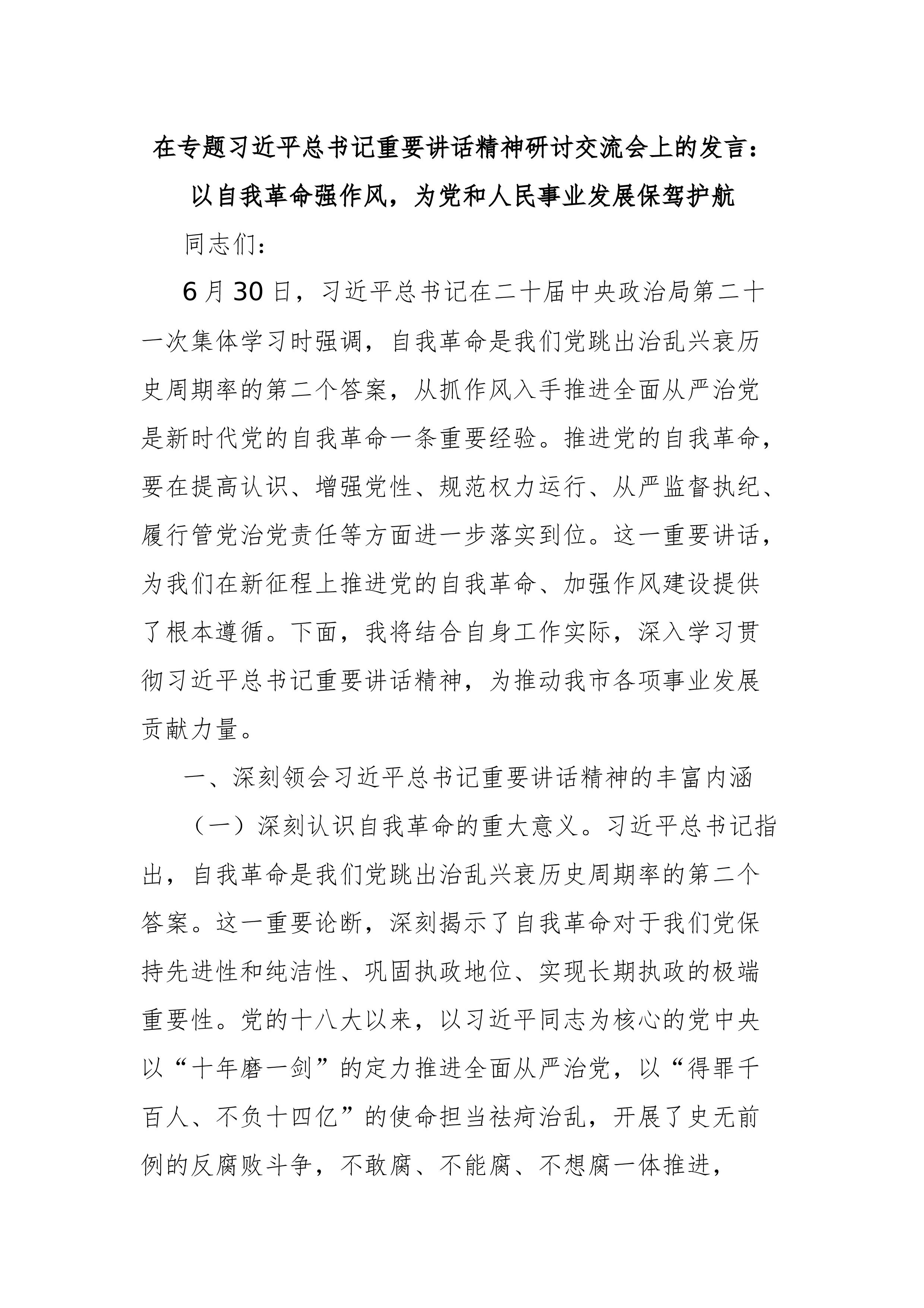 在专题习近平总书记重要讲话精神研讨交流会上的发言:以自我革命强作风,为党和人民事业发展保驾护航同志们:6月30日,习近平总书记在二十届中央政治局第二十一次集体学习时强调,自我革命是我们党跳出治乱兴衰历史周期率的第二个答案,从抓作风入手推进全面从严治党是新时代党的自我革命一条重要经验。推进党的自我革命,要在提高认识、增强党性、规范权力运行、从严监督执纪、履行管党治党责任等方面进一步落实到位。这一重要讲话,为我们在新征程上推进党的自我革命、加强作风建设提供了根本遵循。下面,我将结合自身工作实际,深入学习贯彻习近平总书记重要讲话精神,为推动我市各项事业发展贡献力量。一、深刻领会习近平总书记重要讲话精神的丰富内涵(一)深刻认识自我革命的重大意义。习近平总书记指出,自我革命是我们党跳出治乱兴衰历史周期...