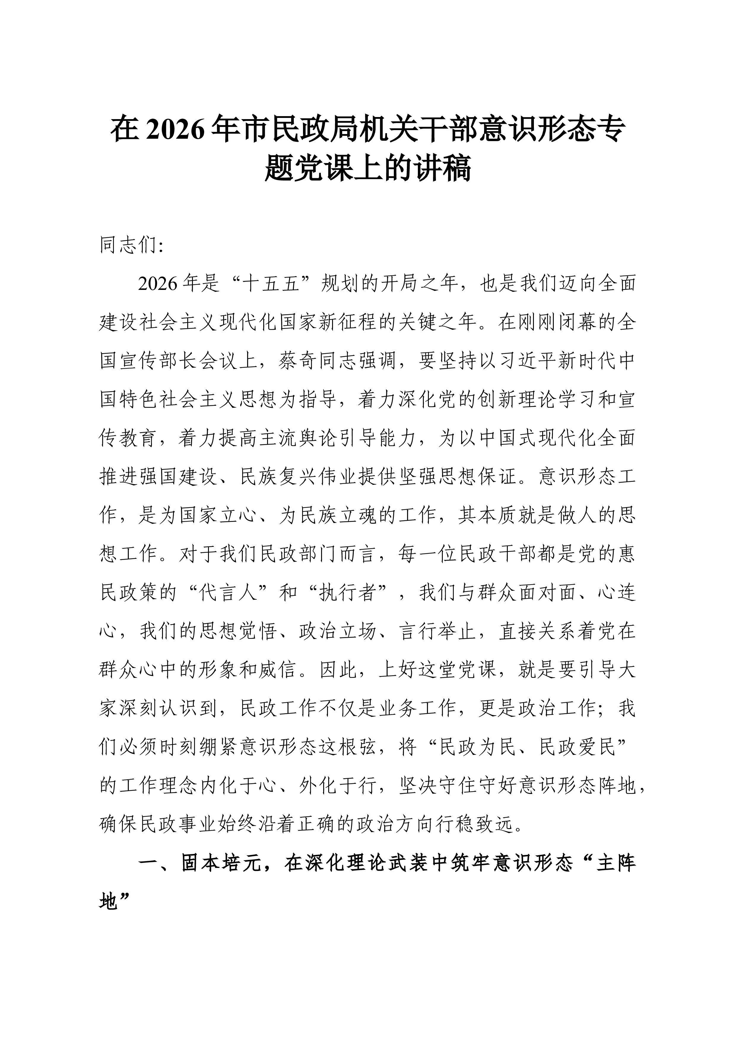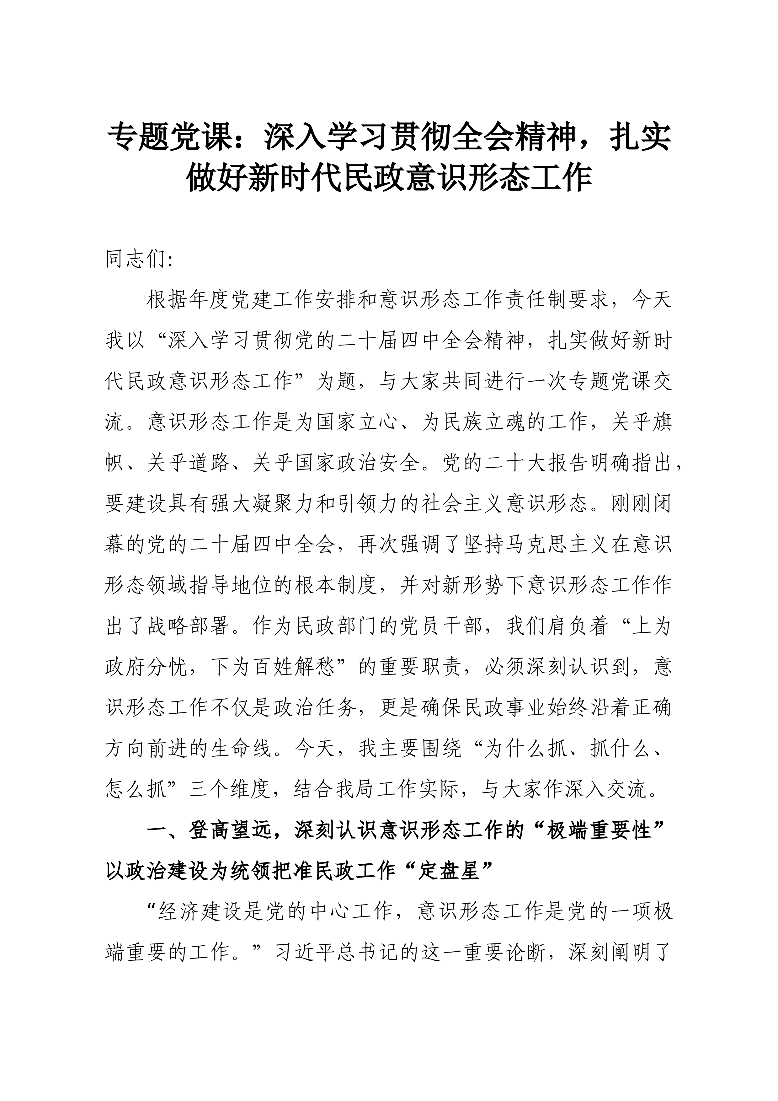 专题党课:深入学习贯彻全会精神,扎实做好新时代民政意识形态工作同志们:根据年度党建工作安排和意识形态工作责任制要求,今天我以“深入学习贯彻党的二十届四中全会精神,扎实做好新时代民政意识形态工作”为题,与大家共同进行一次专题党课交流。意识形态工作是为国家立心、为民族立魂的工作,关乎旗帜、关乎道路、关乎国家政治安全。党的二十大报告明确指出,要建设具有强大凝聚力和引领力的社会主义意识形态。刚刚闭幕的党的二十届四中全会,再次强调了坚持马克思主义在意识形态领域指导地位的根本制度,并对新形势下意识形态工作作出了战略部署。作为民政部门的党员干部,我们肩负着“上为政府分忧,下为百姓解愁”的重要职责,必须深刻认识到,意识形态工作不仅是政治任务,更是确保民政事业始终沿着正确方向前进的生命线。今天,我主要围绕“为...