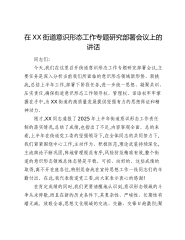 在XX街道意识形态工作专题研究部署会议上的讲话同志们:今天,我们在这里召开街道意识形态工作专题研究部署会议,主要任务是深入分析当前我们所面临的意识形态领域新形势、新挑战,总结上半年工作,部署下阶段任务,进一步统一思想、凝聚共识、压实责任,确保街道意识形态工作领导权、管理权、话语权牢牢掌握在手中,为XX街道的高质量发展提供坚强有力的思想保证和精神动力。刚才,XX同志通报了2025年上半年街道意识形态工作责任制的落实情况,总结了成绩,也指出了不足,内容客观全面。总的来看,上半年在街道党工委的坚强领导下,在全体同志的共同努力下,我们紧紧围绕中心工作,主动作为、积极防范,理论武装持续深化,主流舆论不断巩固,阵地管理规范有序,风险防范精准有效,整个街道的意识形态领域总体态势是平稳、可控、向好的。这些成...