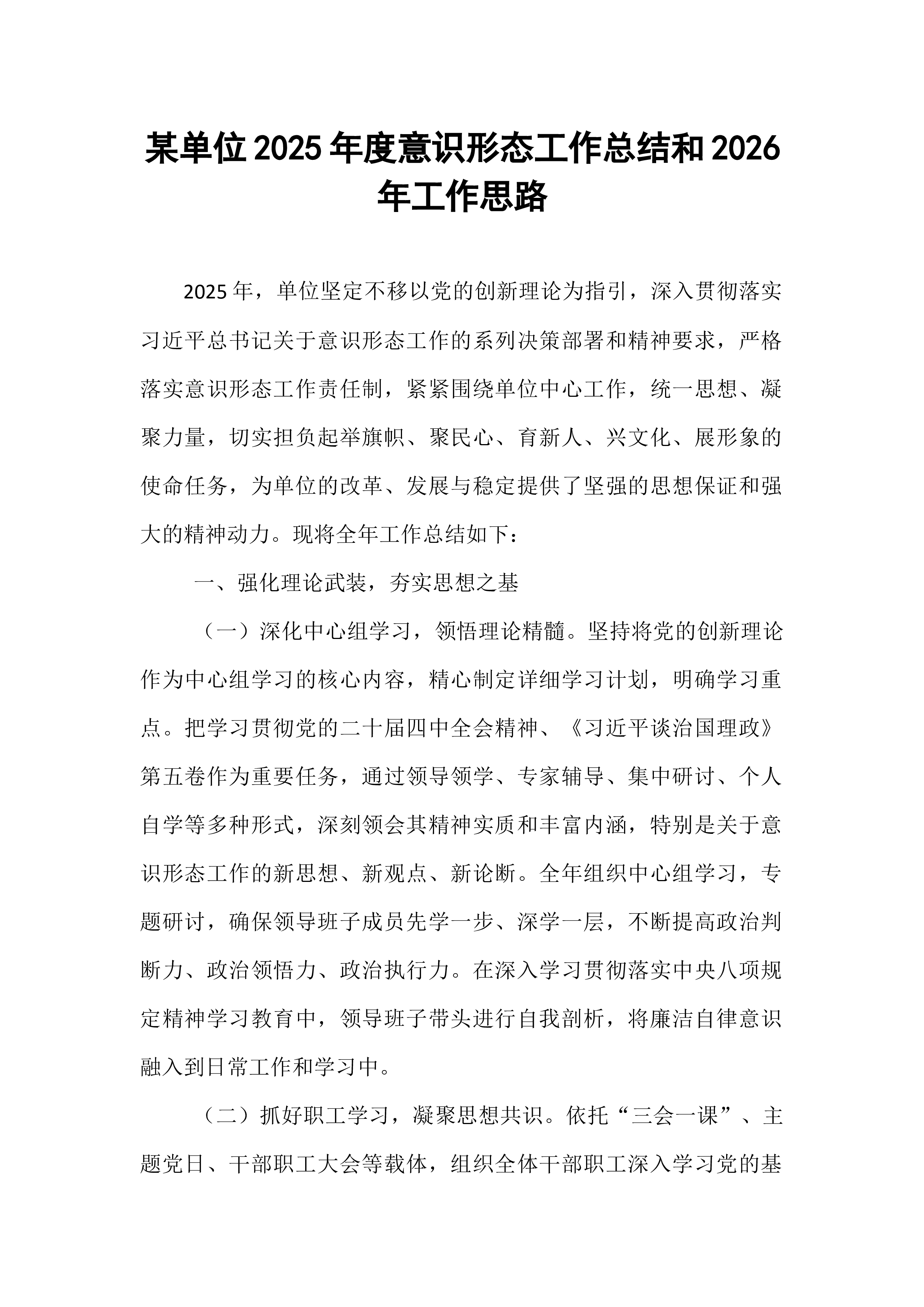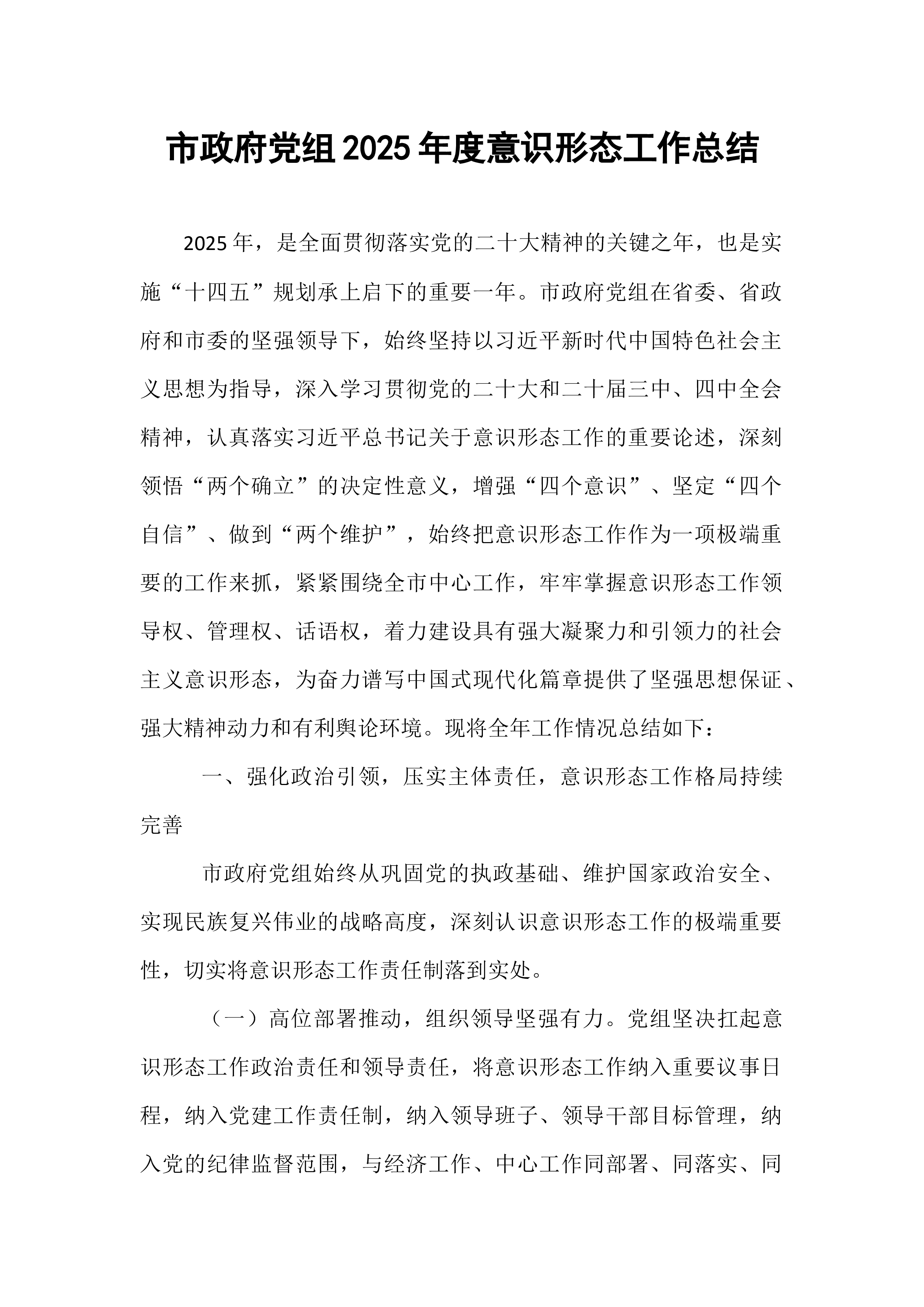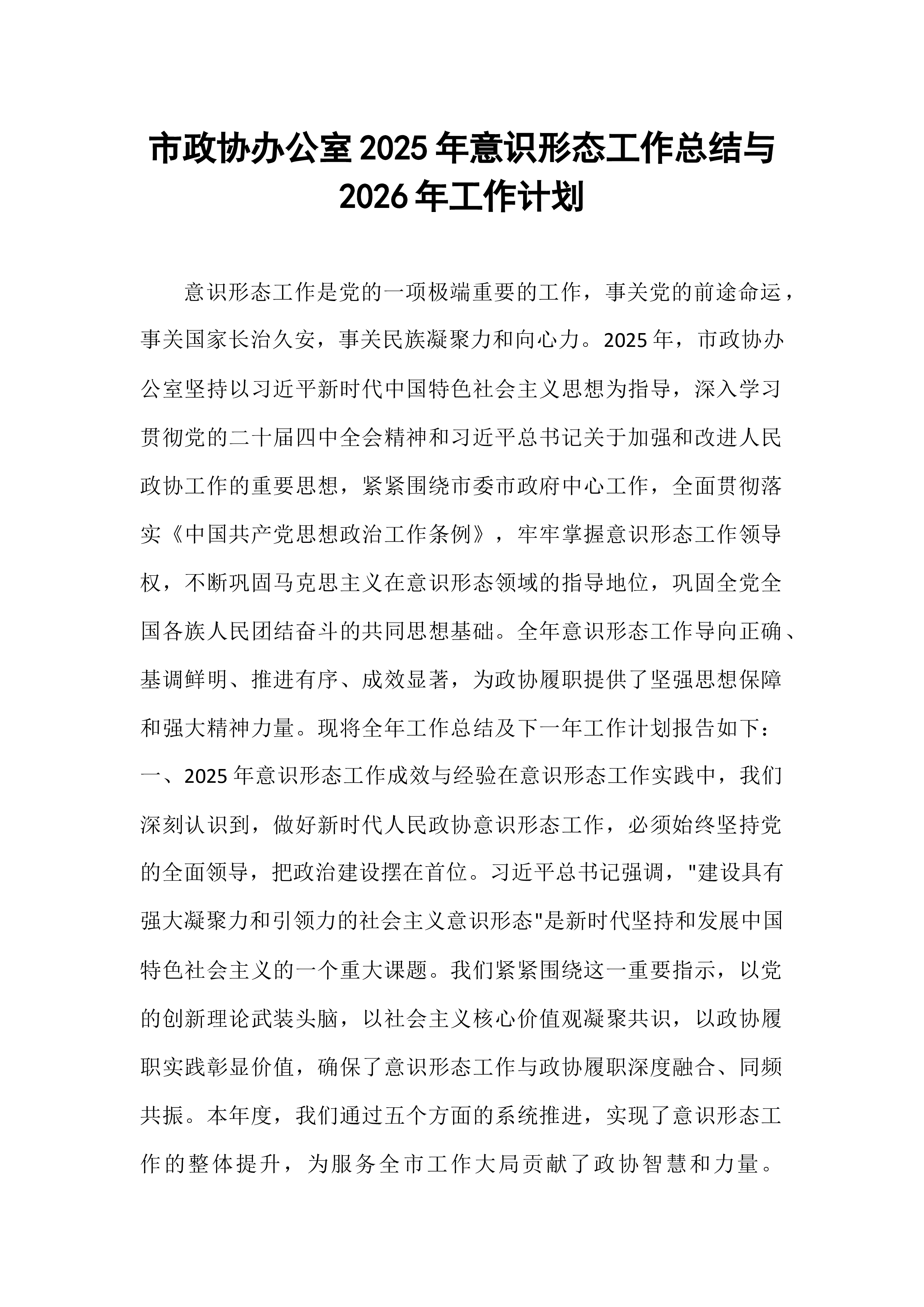 市政协办公室2025年意识形态工作总结与2026年工作计划意识形态工作是党的一项极端重要的工作,事关党的前途命运,事关国家长治久安,事关民族凝聚力和向心力。2025年,市政协办公室坚持以习近平新时代中国特色社会主义思想为指导,深入学习贯彻党的二十届四中全会精神和习近平总书记关于加强和改进人民政协工作的重要思想,紧紧围绕市委市政府中心工作,全面贯彻落实《中国共产党思想政治工作条例》,牢牢掌握意识形态工作领导权,不断巩固马克思主义在意识形态领域的指导地位,巩固全党全国各族人民团结奋斗的共同思想基础。全年意识形态工作导向正确、基调鲜明、推进有序、成效显著,为政协履职提供了坚强思想保障和强大精神力量。现将全年工作总结及下一年工作计划报告如下:一、2025年意识形态工作成效与经验在意识形态工作实践中,...
