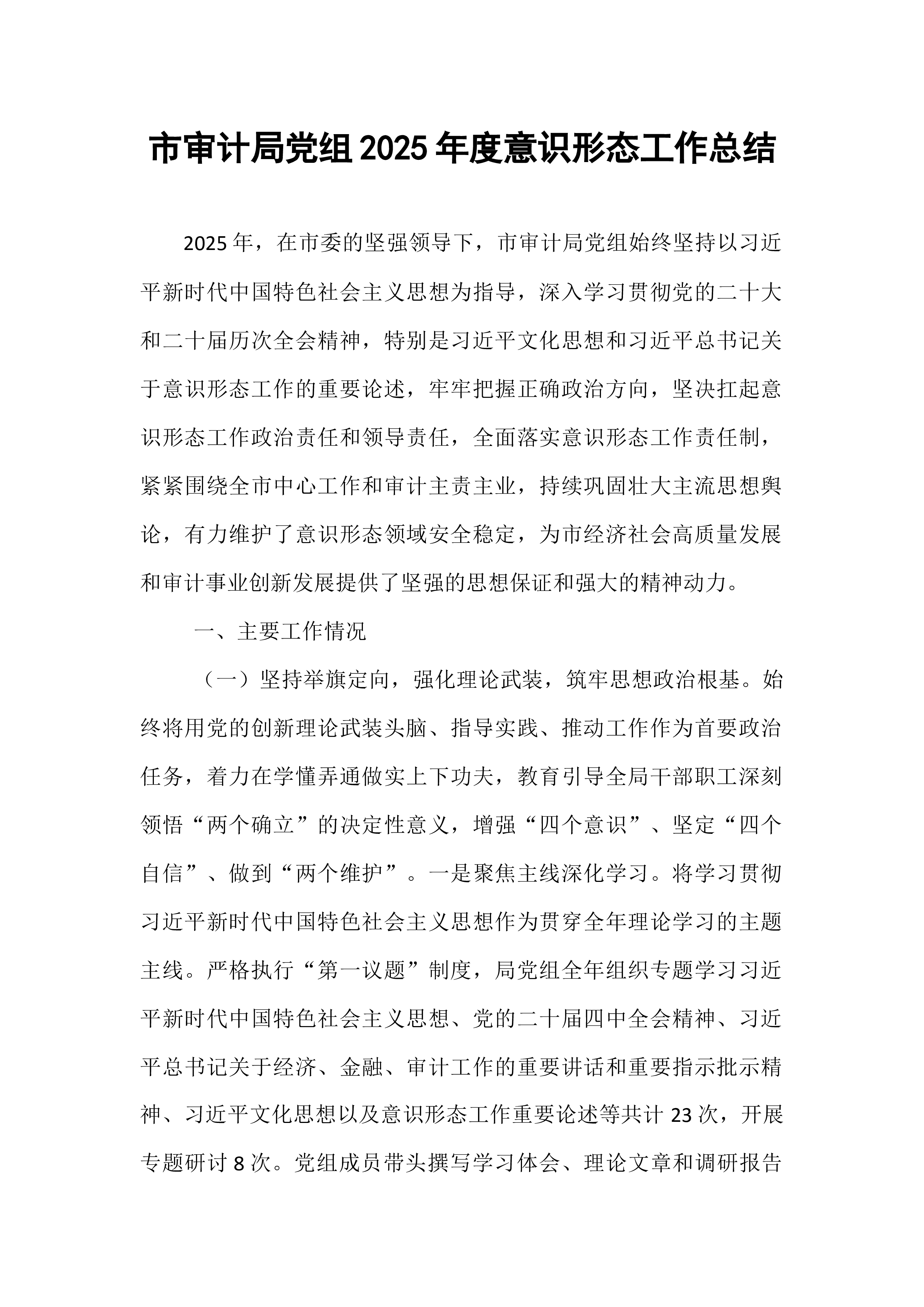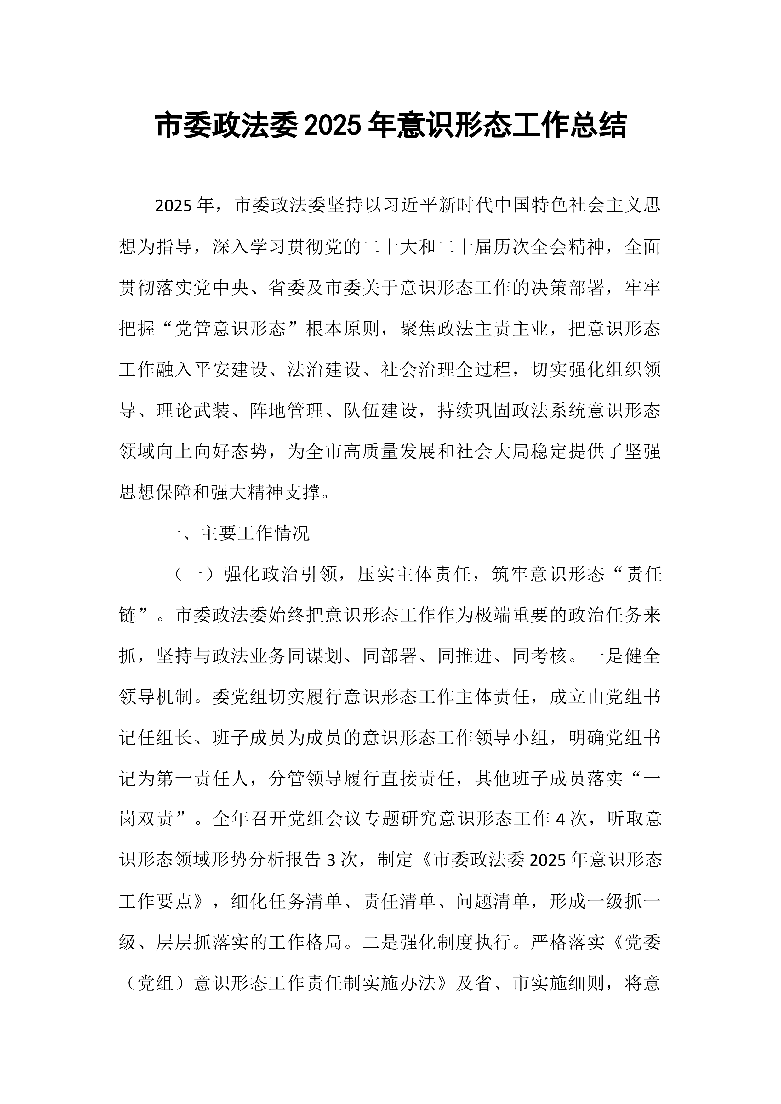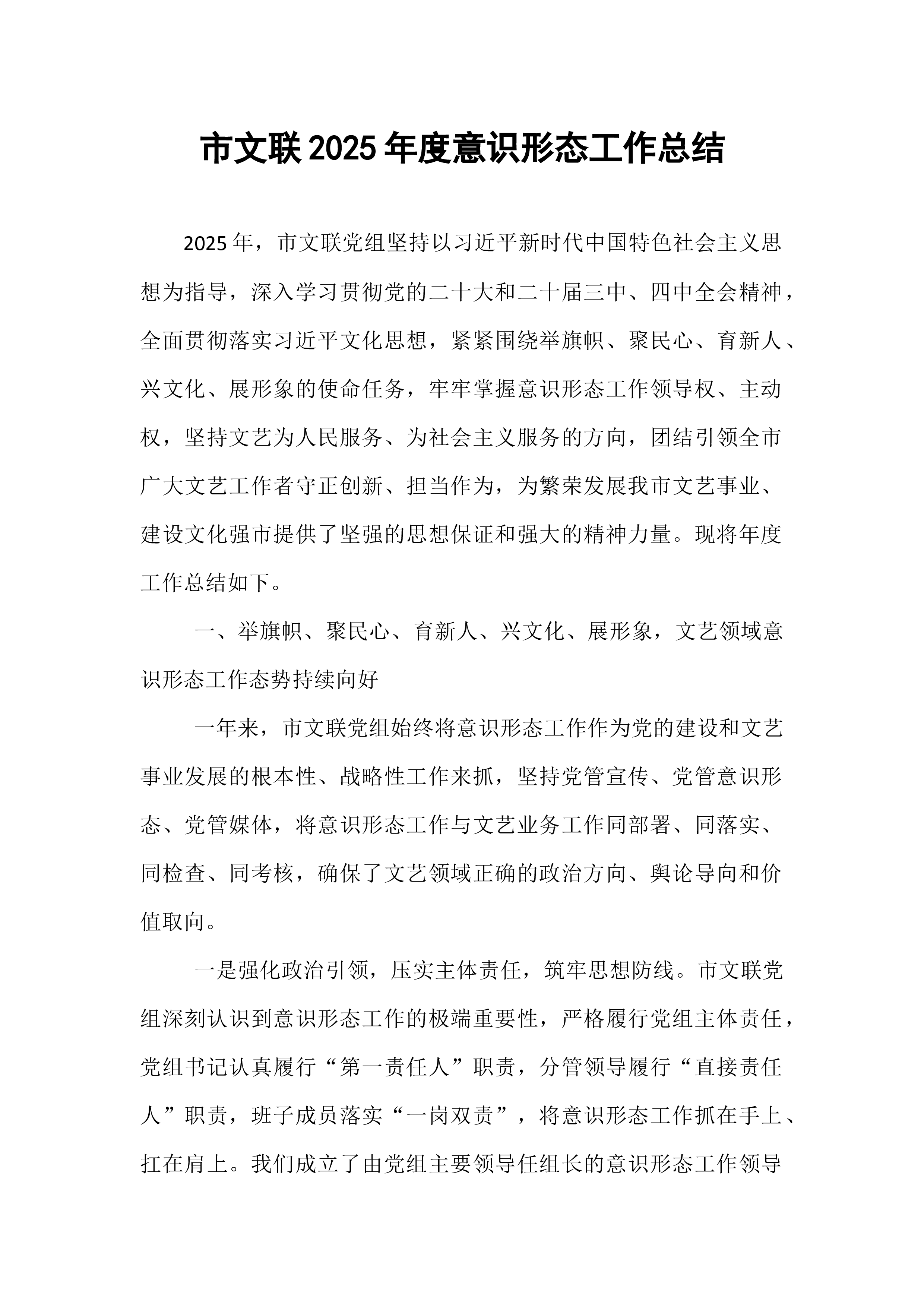 市政协办公室2025年意识形态工作总结与2026年工作计划意识形态工作是党的一项极端重要的工作,事关党的前途命运,事关国家长治久安,事关民族凝聚力和向心力。2025年,市政协办公室坚持以习近平新时代中国特色社会主义思想为指导,深入学习贯彻党的二十届四中全会精神和习近平总书记关于加强和改进人民政协工作的重要思想,紧紧围绕市委市政府中心工作,全面贯彻落实《中国共产党思想政治工作条例》,牢牢掌握意识形态工作领导权,不断巩固马克思主义在意识形态领域的指导地位,巩固全党全国各族人民团结奋斗的共同思想基础。全年意识形态工作导向正确、基调鲜明、推进有序、成效显著,为政协履职提供了坚强思想保障和强大精神力量。现将全年工作总结及下一年工作计划报告如下:一、2025年意识形态工作成效与经验在意识形态工作实践中,...