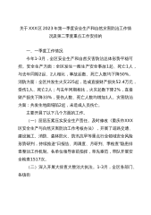 关于XXX区2023年第一季度安全生产和自然灾害防治工作情况及第二季度重点工作安排的一、一季度工作情况今年1-3月,全区安全生产和自然灾害防治总体形势平稳可控。安全生产方面:全区发生一般生产安全事故1起、死亡1人,与去年同期2起、2人相比,事故起数、死亡人数均下降50%。消防方面:全区共发生火灾225起,造成直接财产损失52.4万元,受伤1人、死亡2人;与去年同期相比,火灾起数下降2%,直接财产损失下降33%,受伤人数、死亡人数均增加1人。灾害防治方面:共发生地面塌陷2起,未造成人员伤亡。主要开展了以下几个方面的工作。(一)层层压紧压实安全生产责任。及时修改《重庆市XXX区安全生产与自然灾害防...