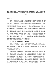 副县长在2023上半年安全生产和自然灾害防治会议上的部署讲话同志们:今天,我们召开县安委会和县减灾委2023年第X次全体(扩大)会议。目的是对上半年全县安全生产与自然灾害防治工作进行再安排再部署再深化,确保下半年安全形势持续稳定。刚才,县安委办通报了前两季度安全生产与自然灾害防治工作整体情况和二季度综合督查情况;县规划自然资源局、县水利局、县气象局、XX镇、XX镇、XX乡分别作了发言,几位同志讲得很好,希望大家认真学习领会,举一反三、狠抓落实。在奕锋县长讲话前我将重点领域安全防范工作再作强调:一、全力以赴抓好洪涝灾害防御。汛期才刚刚开始,各级各部门切不可麻痹大意、安而忘危,要认真总结“X.X”...