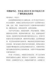 市委副书记、市长在2023年XX市征兵工作广播电视动员讲话青年朋友们、同志们:在全面贯彻落实党的XX大精神之际,XX市2023年征兵工作已全面展开,英雄的人民军队再次向全市广大优秀青年发出召唤。在此,市委、市政府号召全市广大适龄青年响应祖国召唤,踊跃报名应征,投身绿色军营,追梦无悔青春。习近平总书记指出,强国必须强军,军强才能国安。巩固的国防和强大的军队,既是维护国家主权、安全、发展利益的坚强后盾,也是新时代坚持和发展中国特色社会主义、实现中华民族伟大复兴的战略支撑。国防和军队的建设,迫切需要高素质、有志向的优秀青年投身军营,勇敢承担起实现强军目标的历史使命。我们必须深入贯彻习近平强军思想,把...