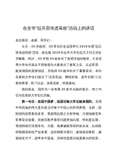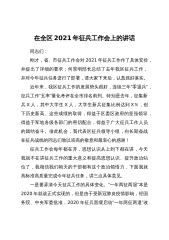 根据会议安排,我简要总结一下去年全区征兵工作情况,就今年征兵工作总体安排和需要把握的问题讲几点意见。2021年我区征兵工作,在区委区政府的坚强领导下,紧紧围绕提高兵员质量这一核心,狠抓征兵准备,严把标准条件,落实政策纪律,顺利完成市征兵办赋予的*名义务兵征集任务,上站人数、大学生人数达到历史新高,征集大学生*。二本以上学历*人,大学生比例占*%。这些成绩的取得来之不易,凝聚了各级党委、政府和广大征兵工作人员的辛苦汗水。主要有4个方面特点:(一)靠坚强领导聚合力量。区委、区政府历来重视征兵工作,着力打造“*兵”品牌。区委领导专门听取人武部征兵工作汇报,详细了解工作进展、任务指标情况。区政府分管领...