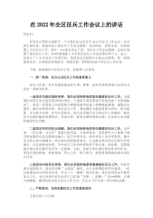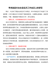 同志们:为圆满完成市政府、军分区赋予我县今春征兵工作任务,县人民政府、县人武部决定召开这次全县征兵工作会议。刚才,X部长传达了地区征兵工作会议精神,总结了2021年征兵工作,安排部署了今春征兵任务。X就如何做好今春征兵工作提出了三点要求,希望大家认真抓好落实。下面,我讲几点意见。一、统一思想,提高认识,切实增强做好新形势下征兵工作的责任感和使命感。征兵工作事关国防和军队质量建设,事关维护国家安全统一和领土完整。军队稳固,社会才会稳定、人民才会安康。当前,我国经济社会发展正处于难得的战略机遇期,坚持XJP新时代中国特色社会主义思想,加快构建社会主义和谐社会,已成为全国上下的主旋律。但我们必须清醒...