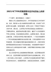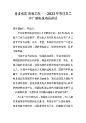 身披戎装青春启航——2023年市征兵工作广播电视动员讲话青年朋友们、同志们:在全面贯彻落实党的二十大精神之际,XX市2023年征兵工作已全面展开,英雄的人民军队再次向全市广大优秀青年发出召唤。在此,市委、市政府号召全市广大适龄青年响应祖国召唤,踊跃报名应征,投身绿色军营,追梦无悔青春。习近平总书记指出,强国必须强军,军强才能国安。巩固的国防和强大的军队,既是维护国家主权、安全、发展利益的坚强后盾,也是新时代坚持和发展中国特色社会主义、实现中华民族伟大复兴的战略支撑。国防和军队的建设,迫切需要高素质、有志向的优秀青年投身军营,勇敢承担起实现强军目标的历史使命。我们必须深入贯彻习近平强军思想,把更...