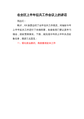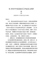 在2019年全县征兵工作会议上的讲话XX(2019年7月29日上午,XXX)同志们:今天,我们在这里召开全县征兵工作会议,主要任务是贯彻落实省、市征兵工作会议精神,回顾总结我县去年征兵工作情况,全面部署今年征兵工作任务。刚才,县人武部政委XXX同志宣读了《2018年度征兵工作先进单位和先进个人表彰通报》;县人武部长XX同志回顾总结了2018年征兵工作情况,部署了2019年征兵任务,并着重对大学生征集工作提出了要求,讲得很全面、很具体、很到位;各乡镇及有关部门还签订了责任书,大家要结合实际,认真抓好落实。下面,我再讲三点意见。一、提高认识,切实增强做好征兵工作的使命感和紧迫感征兵是国防和军队建设...