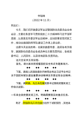 华瑞锋(2022年11月)同志们:今天,我们召开旗委议军会议暨国防动员委员会全体会议,主要任务是学习贯彻党的二十大精神和习近平强军思想,认真落实市委议军会议精神,总结部署党管武装工作,推动全旗国防和军队建设工作再上新台阶。出席今天会议的有:在家的旗委常委,政府各有关领导,旗国防动员委员会各成员单位主要负责同志,各镇党委书记、人武部长,以及驻地部队负责同志。这次会议共五项议程:首先,请大家共同观看国防安全形式专题教育片。◆◆◆◆◆◆◆◆下面,请旗人武部政委孙月林同志传达习近平总书记关于国防和军队建设重要讲话精神及市委议军会议精神。◆◆◆◆◆◆◆◆下面,请阿镇、乌兰木伦镇党委书记围绕党管武装工作依...
