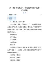 第二批“不忘初心、牢记使命”知识竞赛(310题)目录一、单选题(共100道).................................................................................................................1二、多选题(共50道)三、判断题(共50道)四、填空题(共40道)五、问答题(共70道)一、单选题(共100道)1.十九大的主题是:不忘初心,(),高举中国特色社会主义伟大旗帜,决胜全面建成小康社会,夺取新时代中国特色社会主义伟大胜利,为实现中华民族伟大复兴的中国梦不懈奋斗。A.继续前进B.牢记...