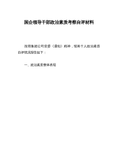 政治建设个人自评材料范文按照县委组织部《x县县管领导干部班子及成员政治建设政治建设考察方案》要求,现将本人政治建设有关情况汇报如下:一、基本情况1、政治上忠诚可靠。本人能够牢固地树立“四个意识”,坚决做到“两个维护”。在思想上政治上行动上同以习近平同志为核心的党中央保持高度一致;能够做到“五个必须”,杜绝“七个有之”,不当“两面人”,不在公开场合或私下里妄议中央大政方针;坚决服从组织安排,从不与组织讨价还价。坚决贯彻落实单位党组决策部署,从不搞变通执行。高度重视理论学习,对党的十九大精神、党章和其他应知应会知识熟悉,而且能够在工作中加以应用。同时,能够坚持清醒地运用正反典型来反思与警醒自我。一...