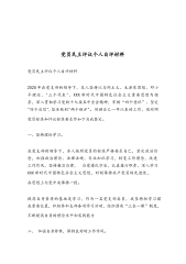 党员民主评议个人自评材料党员民主评议个人自评材料2020年在党支部的领导下,本人坚持以马列主义、毛泽东思想、邓小平理论、"三个代表"、XXX新时代中国特色社会主义重要思想为指导,深入贯彻学习党的十九届五中全会精神,牢树“四个意识”、坚定"四个自信",坚决做到"两个维护"。回顾自己一年以来的工作,现对照党员标准和评议标准要求作如下自我鉴定。一、坚持理论学习。在党支部的领导下,本人按照党员的标准严格要求自己,坚定政治信念,加强政治理论、法律法规、专业知识学习,转变工作理念,改进工作作风,坚持廉洁自律,自觉遵纪守法,认真履行职责,深入学习XXX新时代中国特色社会主义思想,时刻保持共产党员的先进性,在...