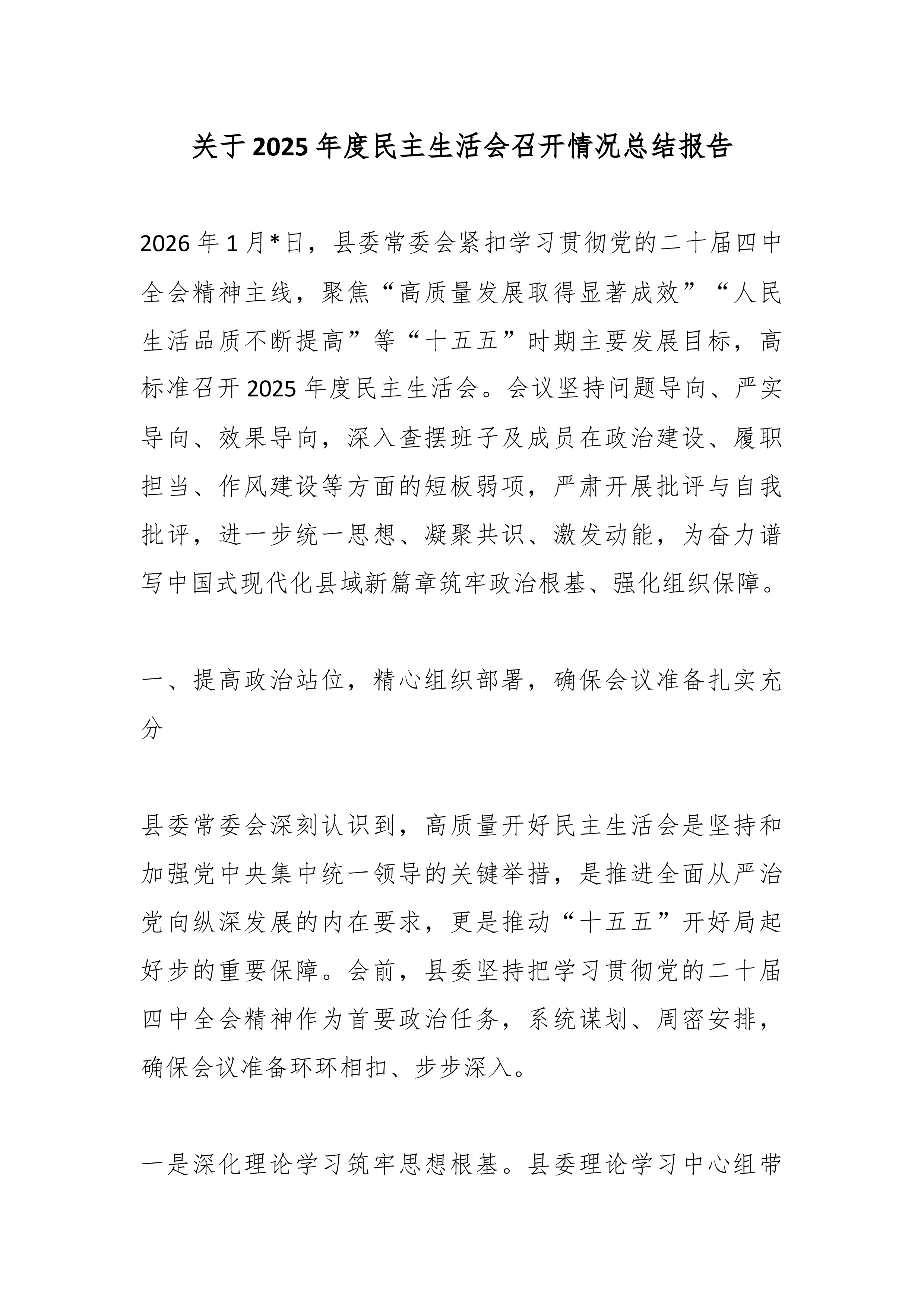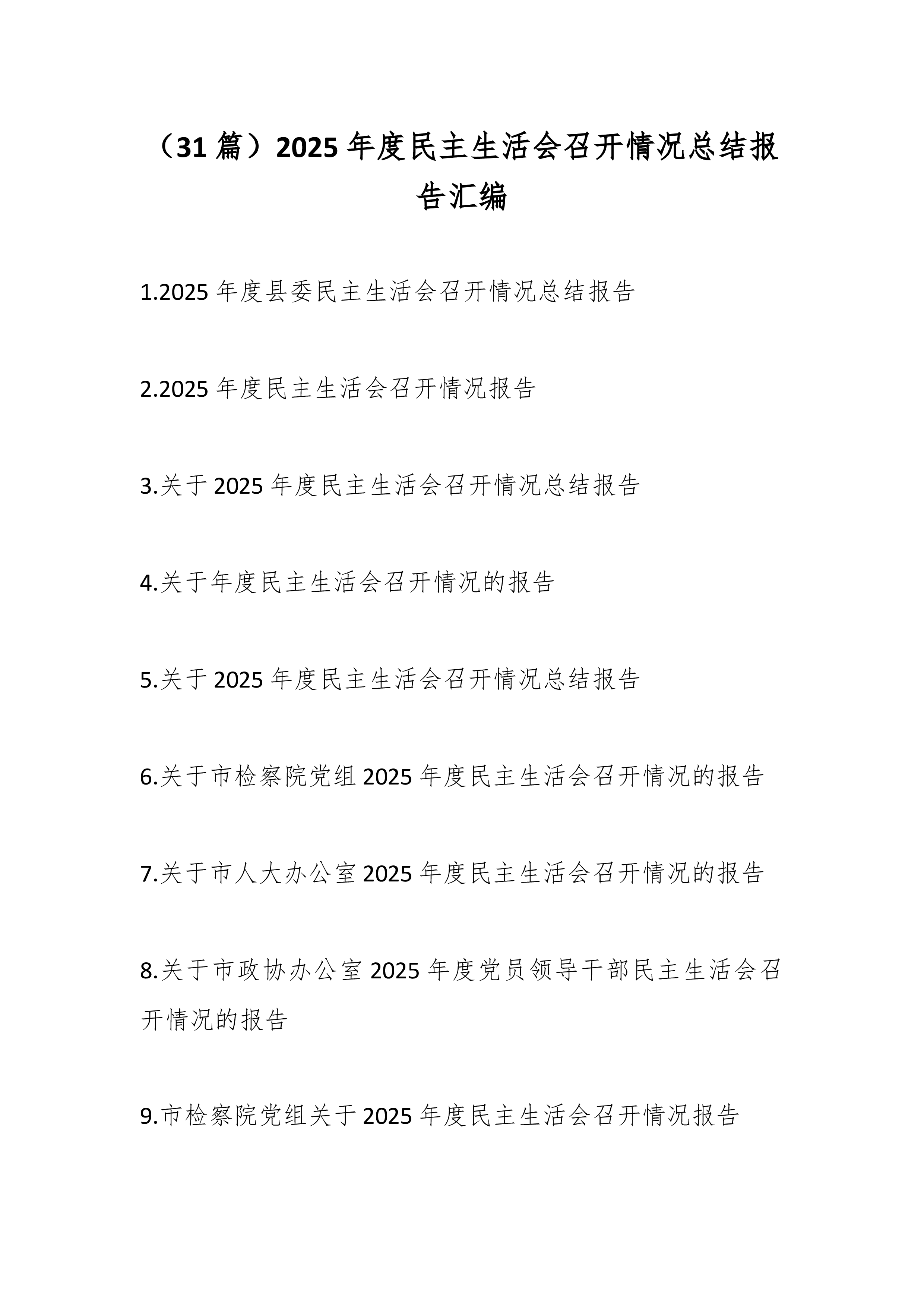 (31篇)2025年度民主生活会召开情况总结报告汇编1.2025年度县委民主生活会召开情况总结报告2.2025年度民主生活会召开情况报告3.关于2025年度民主生活会召开情况总结报告4.关于年度民主生活会召开情况的报告5.关于2025年度民主生活会召开情况总结报告6.关于市检察院党组2025年度民主生活会召开情况的报告7.关于市人大办公室2025年度民主生活会召开情况的报告8.关于市政协办公室2025年度党员领导干部民主生活会召开情况的报告9.市检察院党组关于2025年度民主生活会召开情况报告10.市人大办公室2025年度民主生活会召开情况报告11.市人大党组关于2025年度民主生活会召开情况的报告12.市政府党组2025年度民主生活会召开情况报告13.市政协办公室2025年度民主生活会召开...